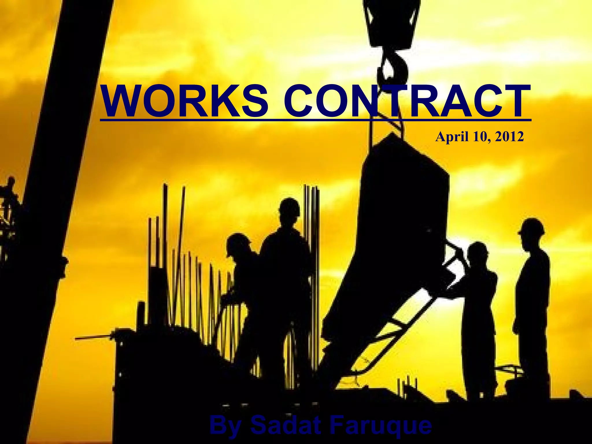 This document discusses works contracts under Indian tax law. It begins by defining works contracts and distinguishing between divisible and indivisible works contracts. It then discusses a key Supreme Court case that determined works contracts do not constitute a "sale of goods" and thus are not subject to sales tax. The document outlines the types of expenses that can be deducted from the contractual transfer price to determine the taxable amount. It provides examples of how tax is calculated for works contracts in two case studies. Finally, it briefly discusses the composition scheme option for works contracts to pay a compounded 2% tax rate instead of the standard rates.