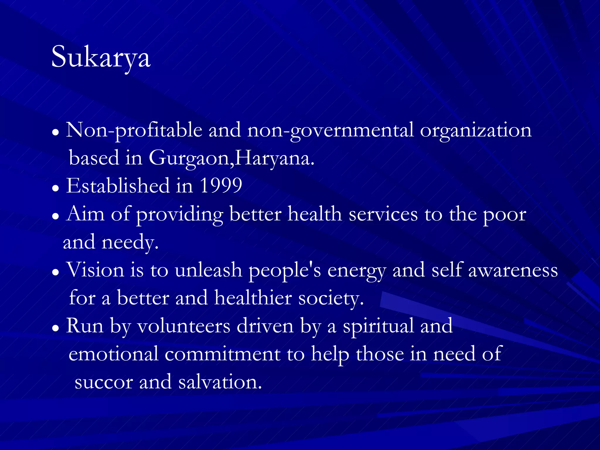 Sukarya is a non-profit and non-governmental organization established in 1999 in Gurgaon, Haryana, aimed at improving health services for underprivileged populations, particularly women, adolescents, and children. The organization conducts various health programs, awareness campaigns, and community development activities to empower these groups and improve maternal and child health, while also providing humanitarian assistance in disaster-affected areas. Sukarya's approach includes grassroots interventions, health promotion camps, and partnerships with local and national health initiatives to achieve better health outcomes in the community.