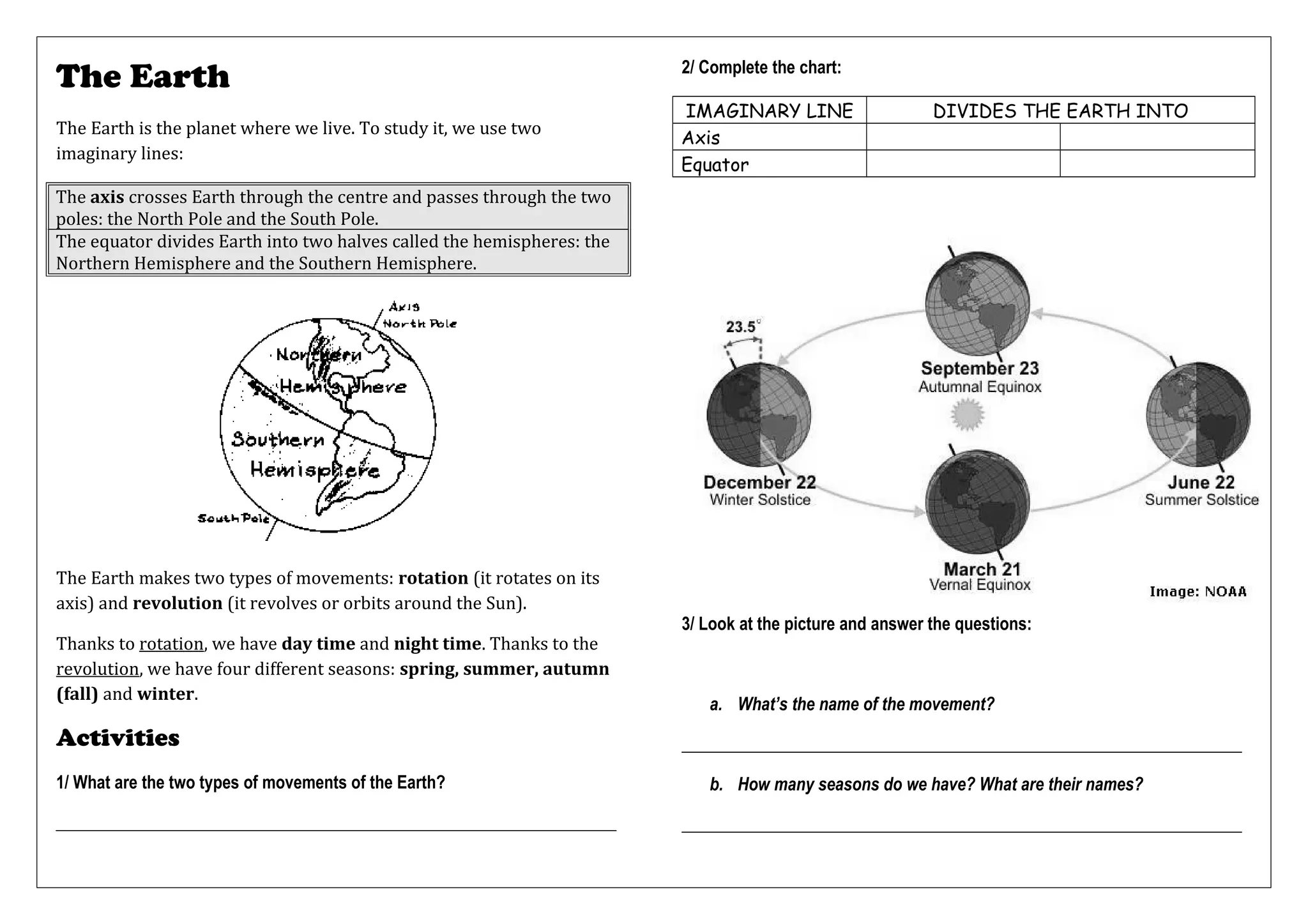 The Earth rotates on its axis, which passes through the North and South Poles, and revolves around the Sun. The equator divides the Earth into the Northern and Southern Hemispheres. Rotation causes day and night, while revolution results in the four seasons - spring, summer, autumn and winter.