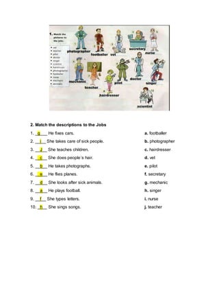 The document is a matching exercise from an English language textbook that asks students to match descriptions of 10 jobs to the correct job title. It provides a key with the correct matches, which includes: mechanic, nurse, teacher, hairdresser, photographer, pilot, vet, footballer, secretary, and singer.