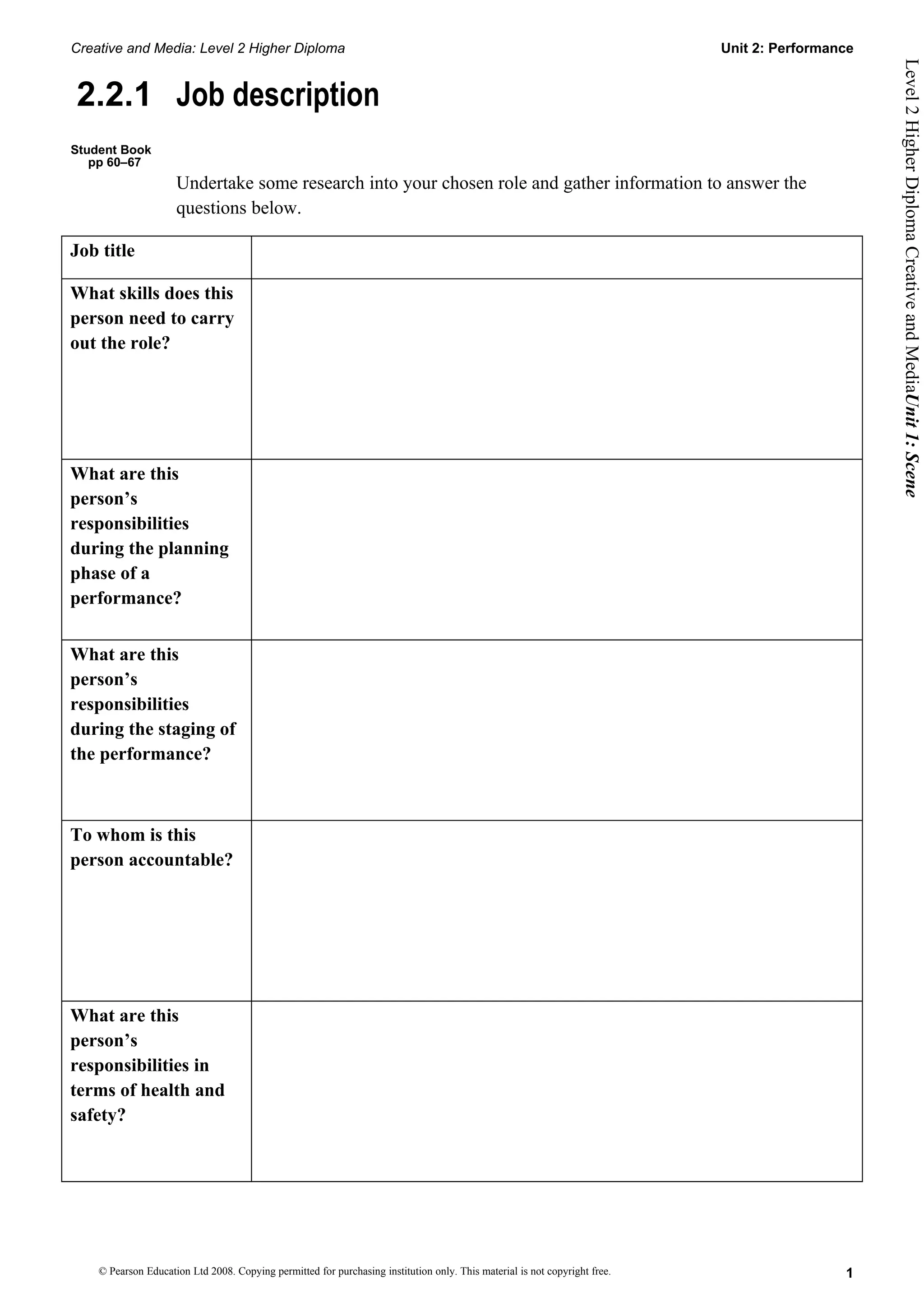 This document provides guidance for a student assignment on researching a performance role. Students are instructed to choose a performance role and answer questions about the skills, responsibilities, and accountabilities of that role during the planning, staging, and health and safety aspects of a performance. The questions cover what skills are needed for the role, what the person's responsibilities are in the planning and staging phases, who they report to, and their health and safety duties.