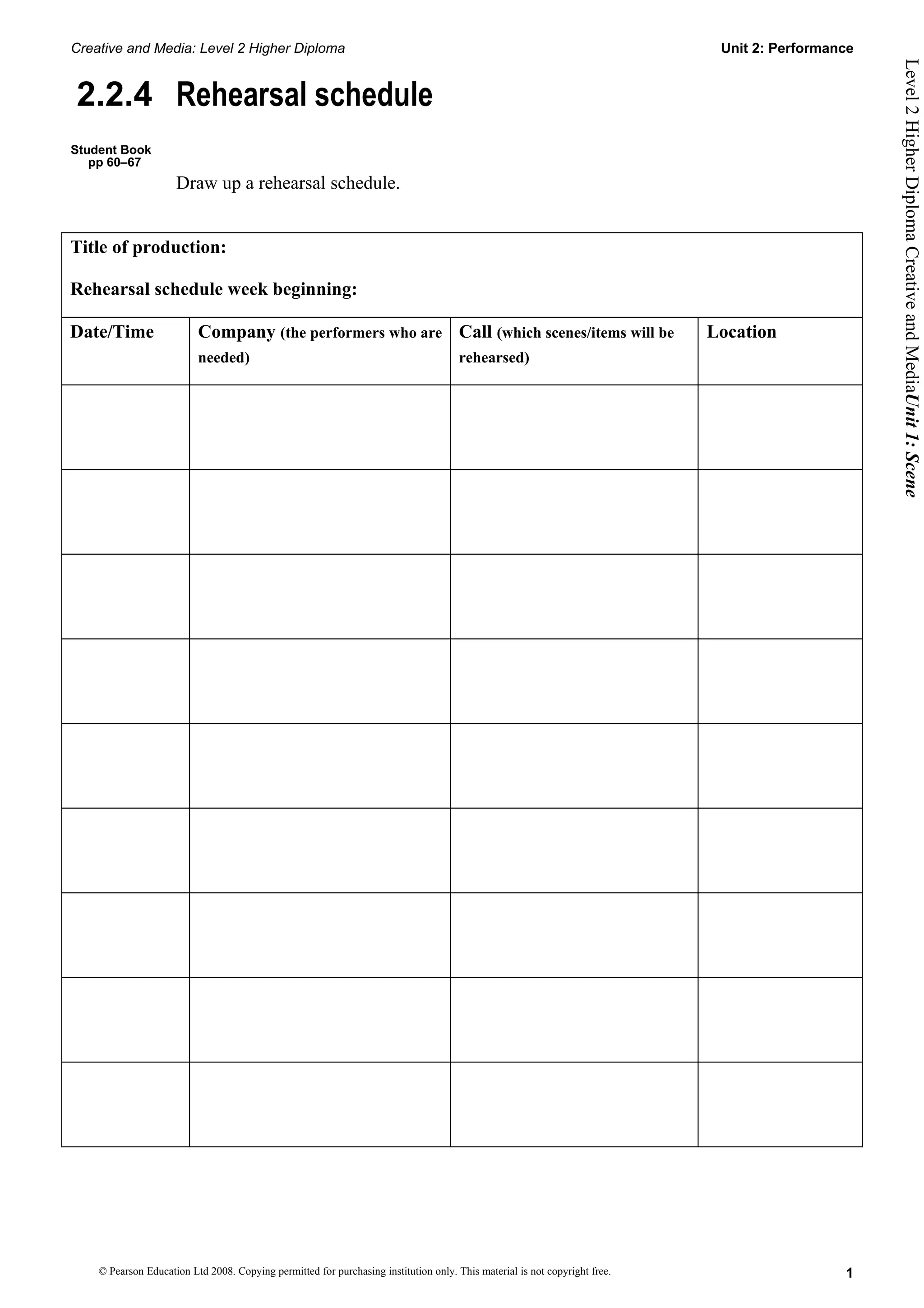 This document provides instructions for students to draw up a rehearsal schedule for an upcoming production, including the date, time, performers needed, scenes or items to be rehearsed, and location for each rehearsal session during the specified week. The schedule is part of a unit on performance for a Level 2 Higher Diploma in Creative and Media studies.