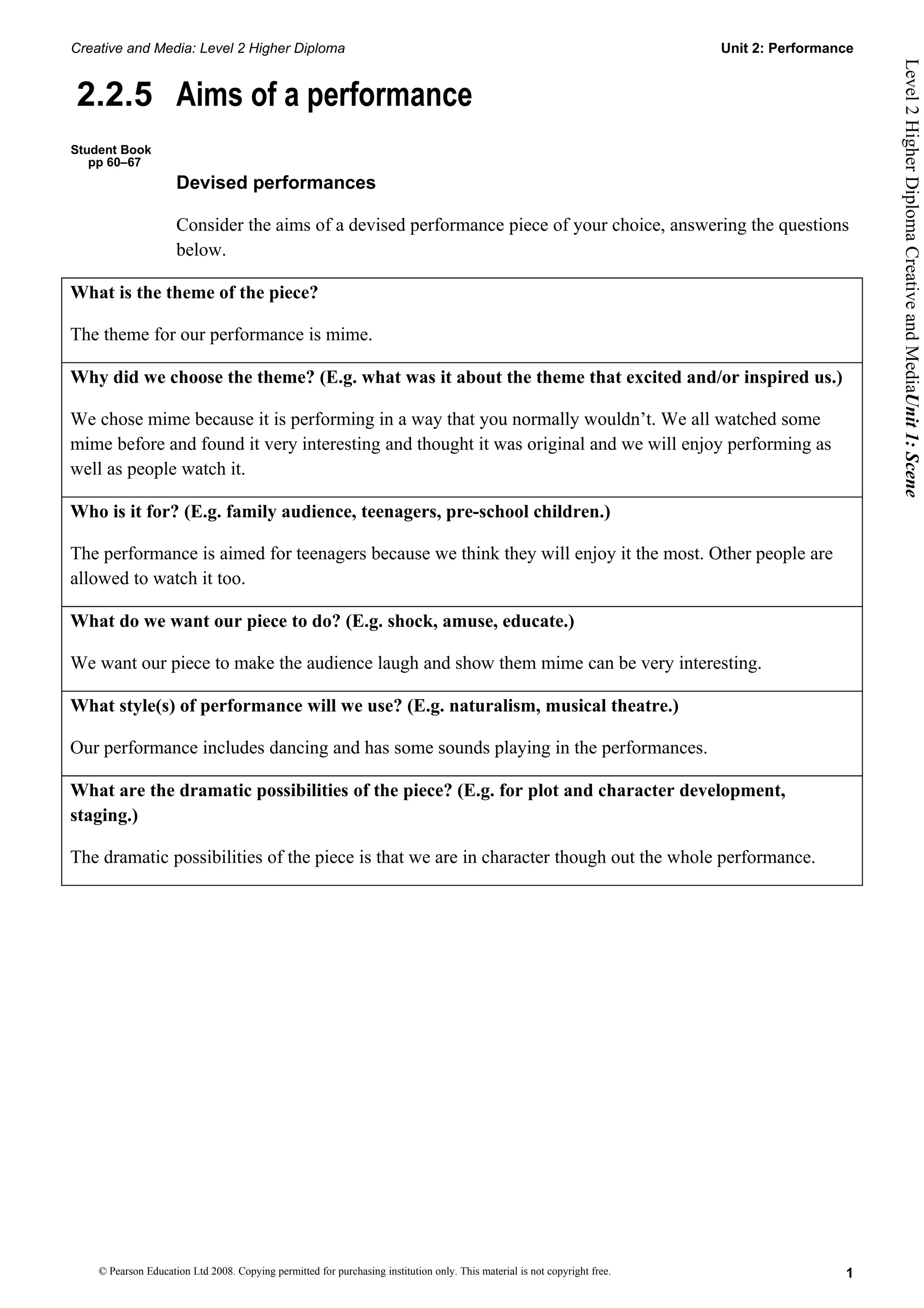 The document discusses the aims of a devised performance piece focused on mime. It notes that the theme is mime, which was chosen because it allows for original performance outside of normal means. The performance is aimed at teenagers to amuse them and show them that mime can be interesting. The style incorporates dancing and sound effects, with dramatic possibilities centered around maintaining character throughout.