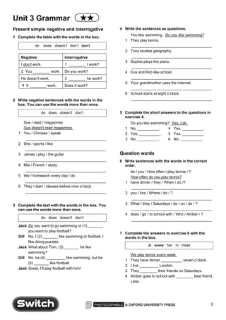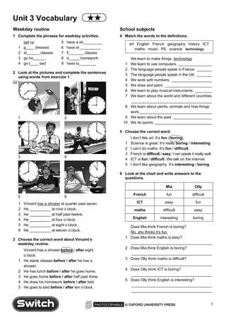 The document contains a vocabulary lesson about weekday routines and school subjects for students. It includes exercises where students must complete phrases about typical weekday activities like getting dressed, having meals, doing homework and going to bed. Other exercises involve matching school subject names to their definitions in English. The lesson also covers present simple verb forms in negative and interrogative sentences, as well as using question words in questions.