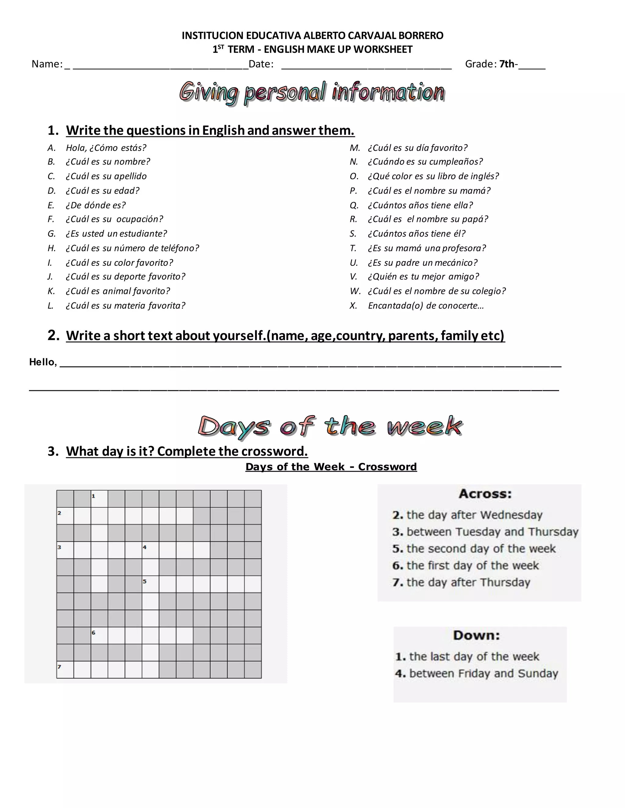 This document appears to be an English worksheet for students containing various exercises to practice English grammar and vocabulary. It includes fill-in-the-blank questions to ask and answer about personal details, writing a short text about oneself, completing a crossword puzzle with days of the week, filling in numbers and months, using pronouns, replacing words with pronouns, providing information about pictures using pronouns and sentences, looking up information and answering questions, unscrambling words to form sentences, and writing adjectives and their opposites. The worksheet contains multiple exercises to help students practice different elements of English.