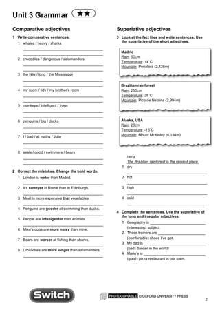 This document contains a vocabulary unit about geographical features and animals. It includes exercises to complete sentences with geographical terms like lake, coast, plain, etc. It also has a crossword puzzle with animal names like whale, crocodile, monkey. There are grammar exercises on comparative and superlative adjectives using terms from the vocabulary lists, such as whales are heavier than sharks and the Brazilian rainforest is the rainiest place.