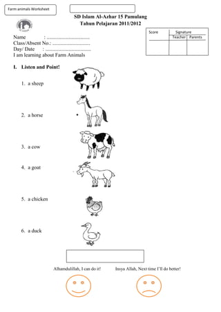 This worksheet is for a student to learn about common farm animals. It instructs the student to listen and point to pictures of six different animals, including a sheep, horse, cow, goat, chicken, and duck. At the end, the student reflects on completing the worksheet and resolving to improve next time.