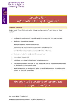 Prensky characterizes today's young people as 'digital natives' who are native speakers of the digital language of computers, video games and the internet. The document provides instructions for a student to find information for their assignment within 20 minutes, including breaking down the assignment title, determining information needs, searching the library website and resources, finding relevant books and articles, recording the search process, and discussing results with other groups.
