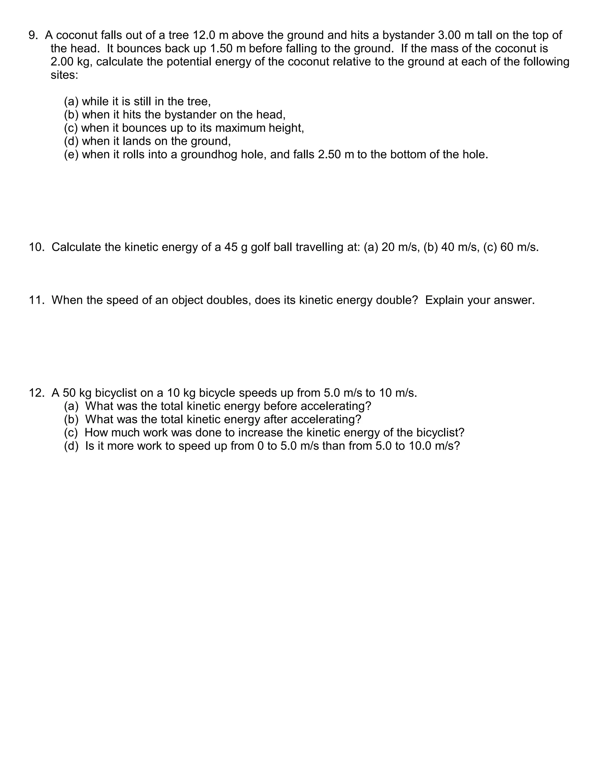 This document contains 32 physics problems involving calculations of work, power, energy, heat, and temperature. The problems cover topics such as calculating work done by forces, kinetic and potential energy, power developed by motors, heat energy required to change temperatures of materials, and using battery energy storage to power electric cars.