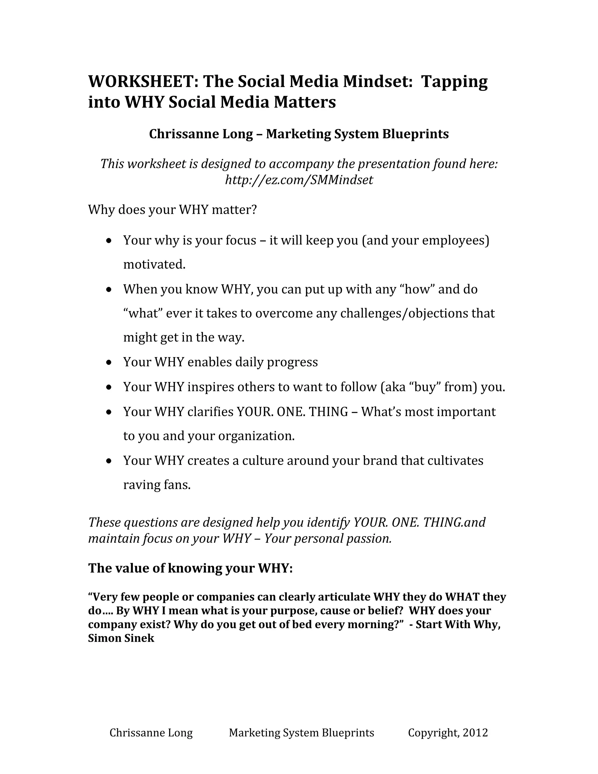 This document provides a worksheet to help identify an organization or individual's "why" for using social media. It explains that having a clear why provides motivation and inspires others. It gives questions to help assess a personal and business why, such as passions, values, goals, and differentiators. Understanding why is important for developing a social media strategy and mindset around a topic, and maintaining focus through any challenges in implementation. The worksheet recommends identifying a "your one thing," watching a TED talk on starting with why, and engaging on social media with others who share the same passion.