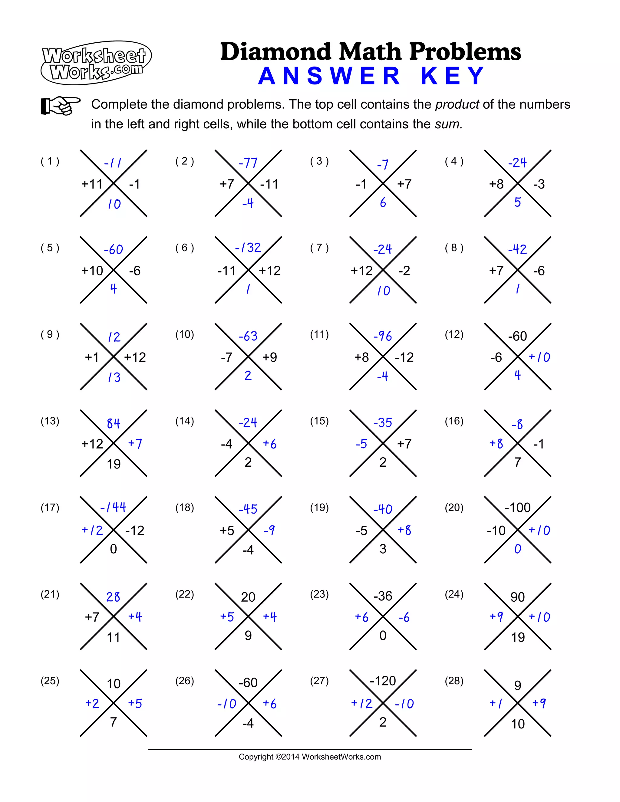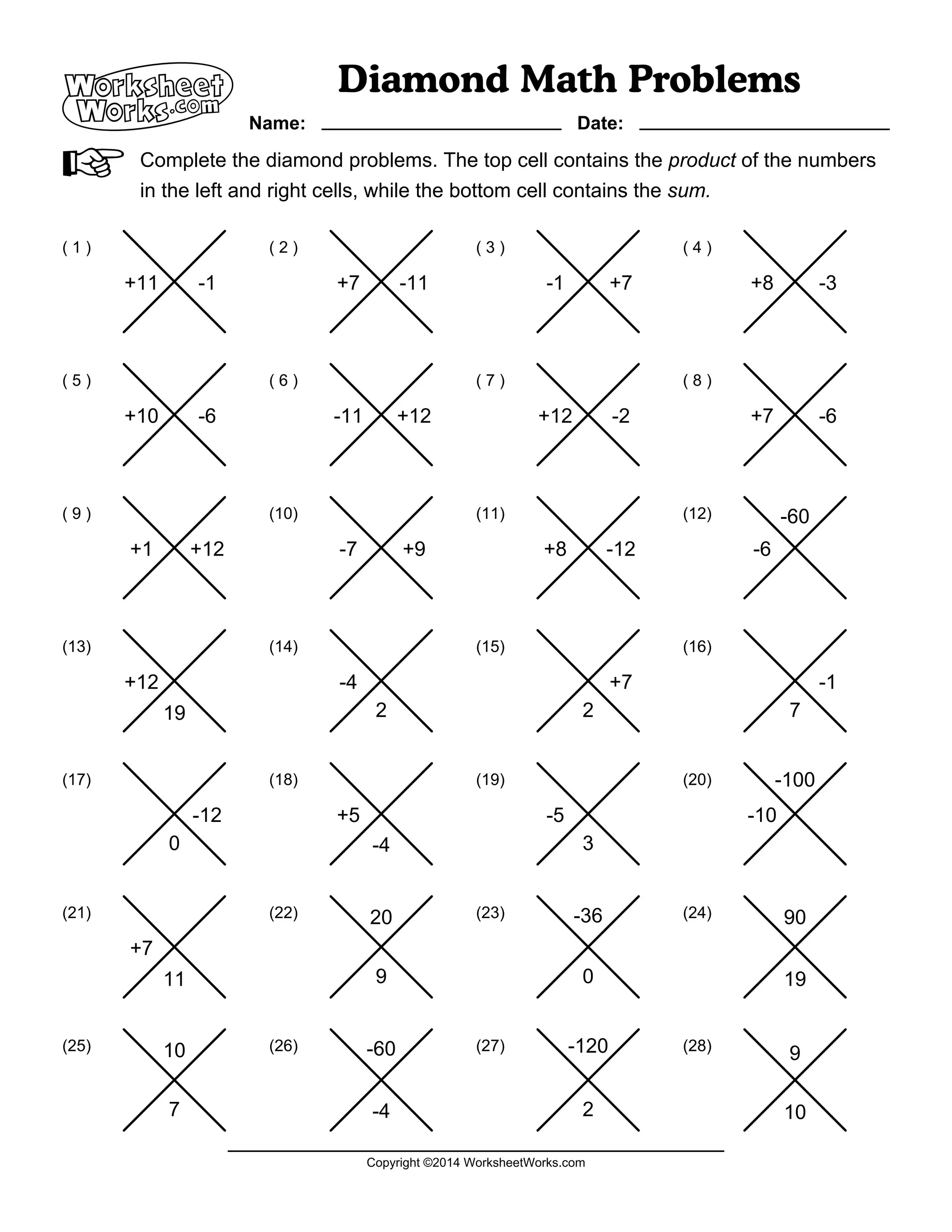 The document contains instructions for completing a series of "diamond math problems". It states that each problem is arranged in a diamond shape with numbers in the left, top and right cells. The top cell shows the product of the left and right cells, while the bottom cell shows the sum of the left and right cells. It provides 28 sample problems to work through.