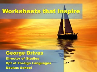 The document discusses the development of worksheets by George Drivas, designed to inspire and aid in the teaching of foreign languages at Doukas School. It outlines key components such as motives, aims, and assessment strategies to enhance effectiveness and engagement. The focus is on planning, preparation, and presentation to ensure clarity and impact in language education.