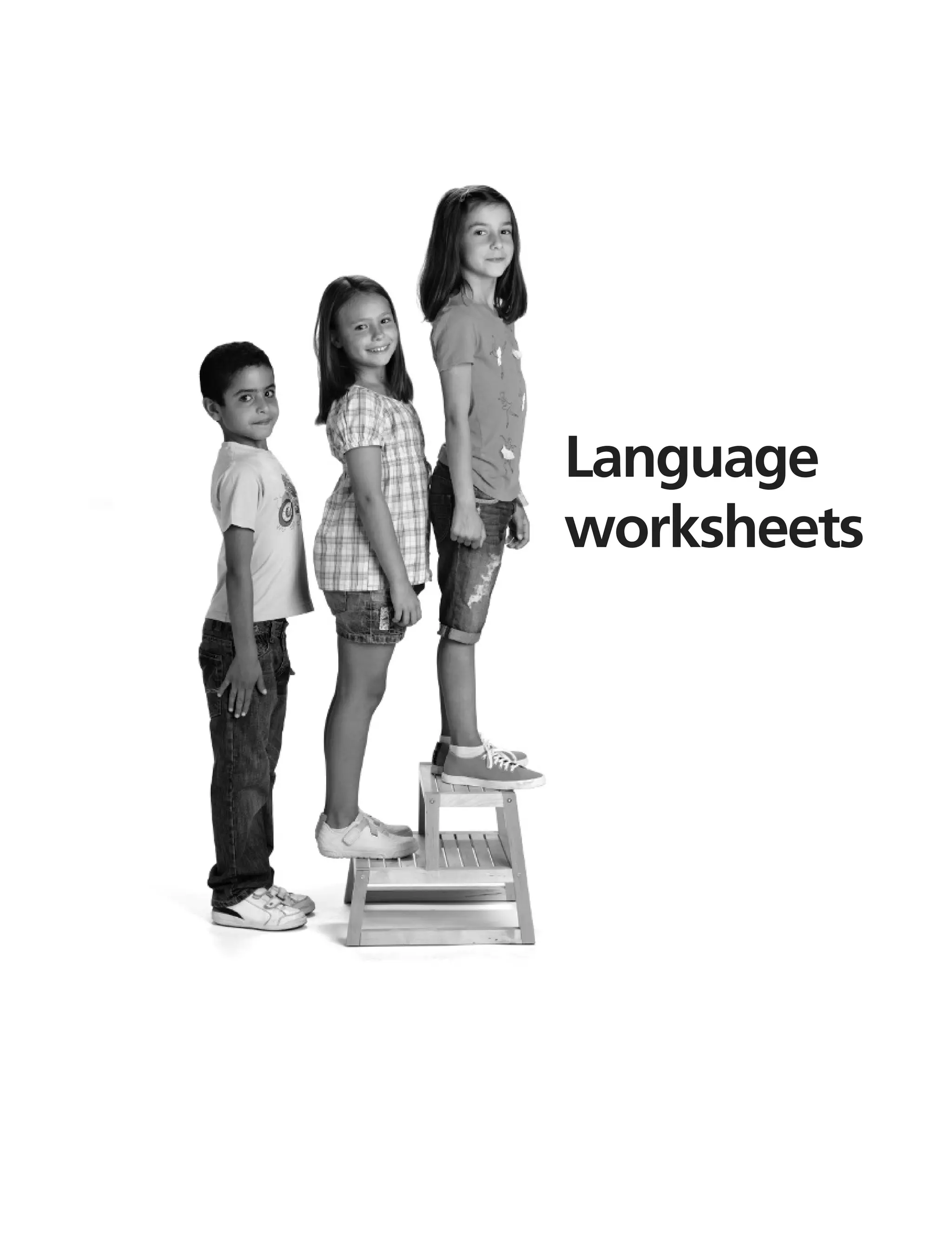 This document contains language worksheets for students learning English. The worksheets cover a variety of topics including school supplies, telling time, describing physical appearance, sports, animals, hobbies, transportation, and summer activities. Each worksheet provides exercises for students to practice targeted vocabulary and language structures through activities such as matching, filling in blanks, writing sentences, and drawing. The worksheets include answer keys.