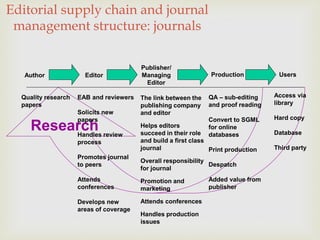 The document discusses the management and editorial processes of academic journals, emphasizing the roles of authors, editors, and reviewers in the publication and promotion of research papers. It also explores collaborative writing practices within higher education, addressing issues such as organization, communication, and conflict management. Additionally, it reviews the application of action research as a pivotal approach in improving academic teaching practices and student engagement.