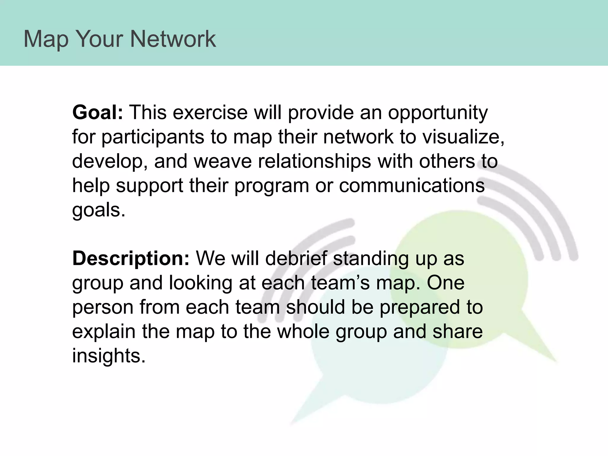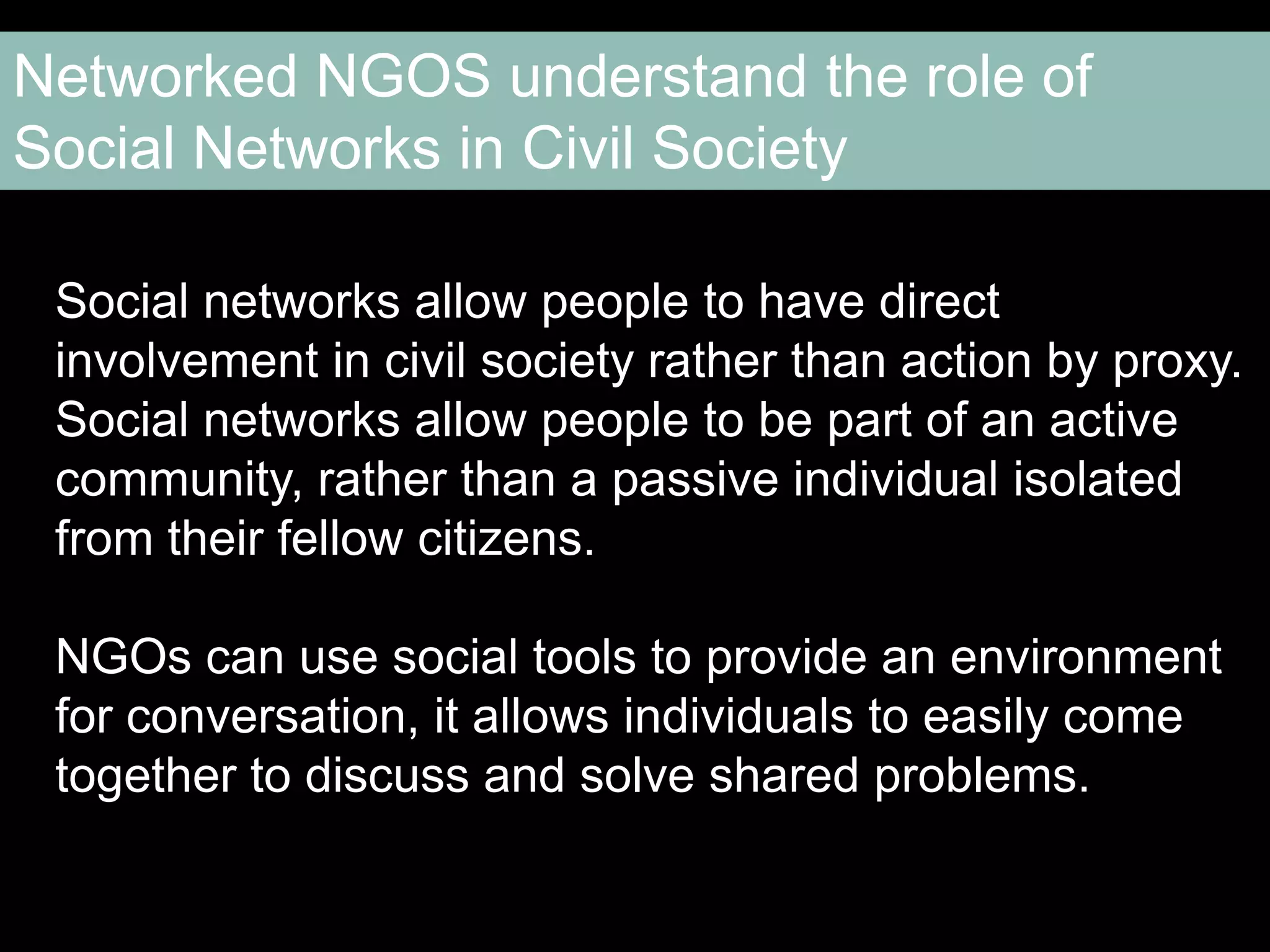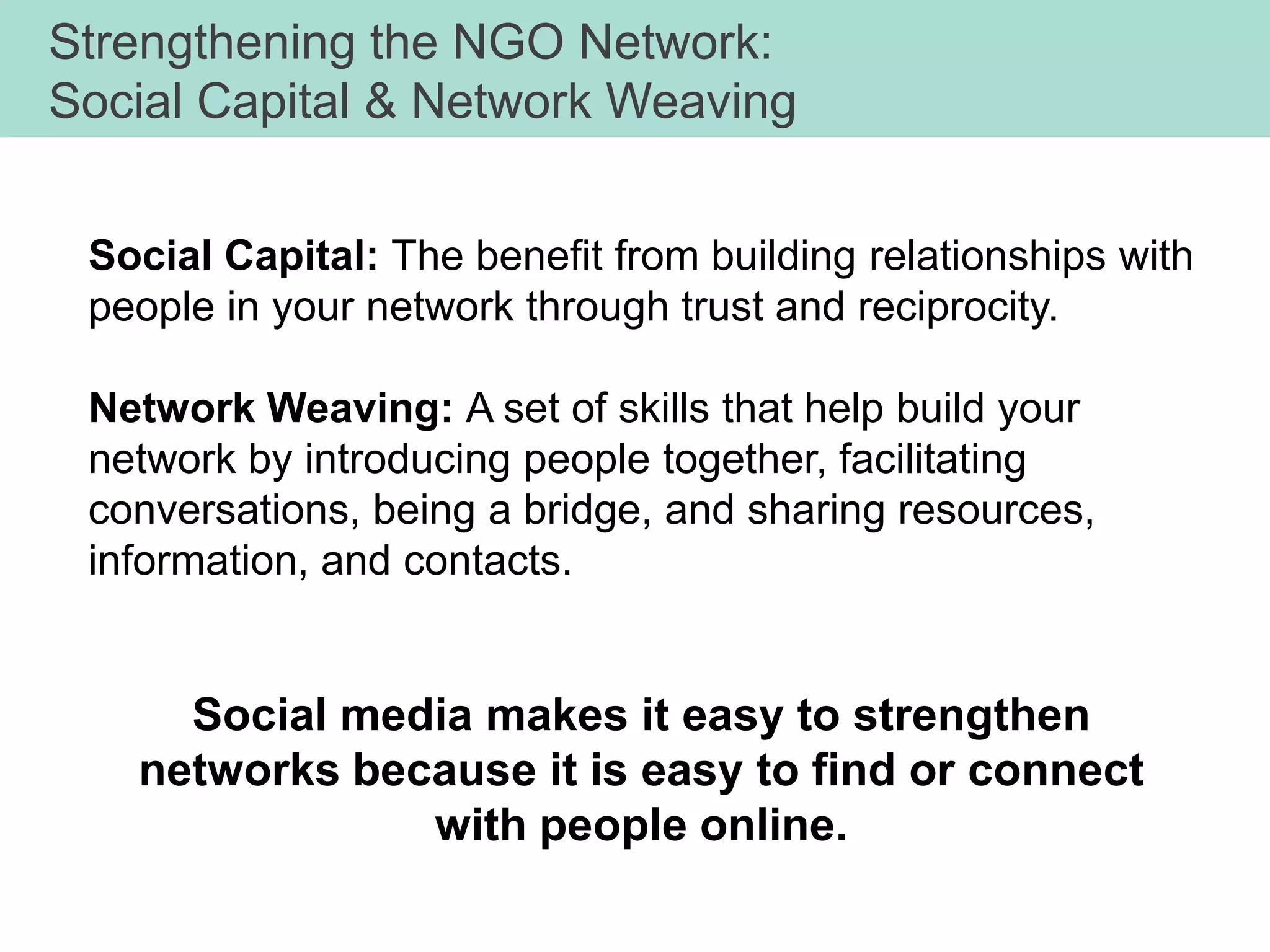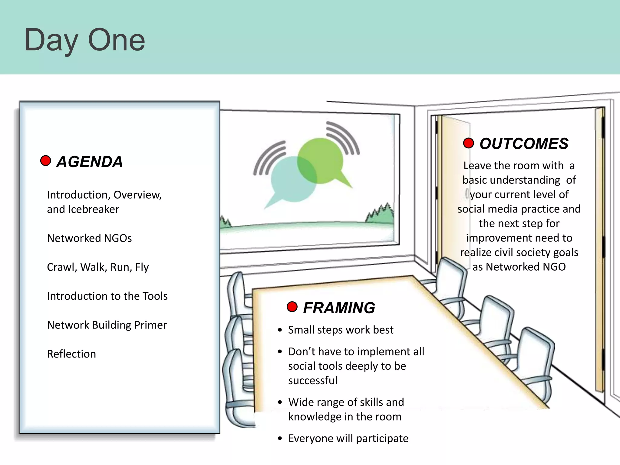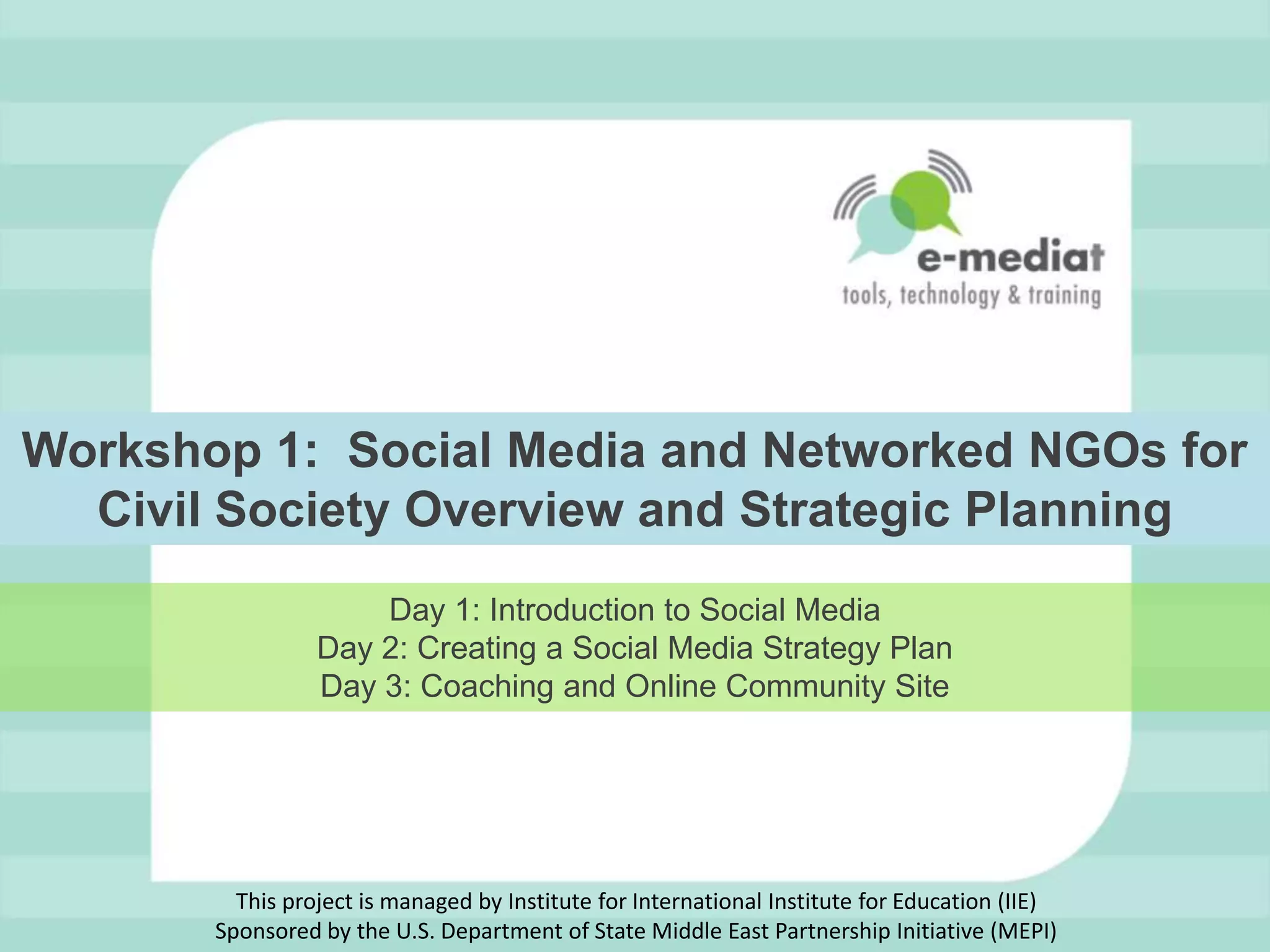 This document provides an agenda and overview for a three-day workshop on using social media and networking to strengthen civil society organizations. Day 1 focuses on introducing social media strategies and having participants evaluate their current social media practices. It covers key concepts like listening, sharing, participating, publishing and network building. Days 2 and 3 continue coaching participants on creating social media plans and using online communities to support their goals. The workshop aims to help civil society groups improve their social media skills and network effectiveness.
