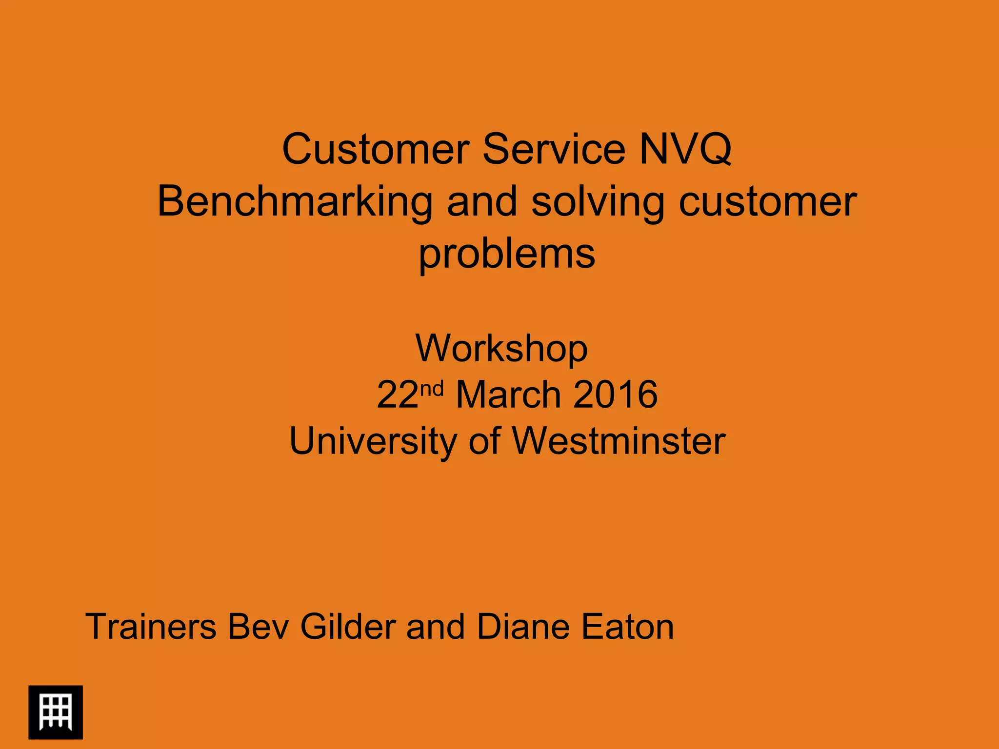 This document provides an overview and objectives of a customer service NVQ workshop held on March 22nd, 2016. The workshop aimed to help participants understand what customers want, the importance of benchmarking and feedback, and how to effectively deal with challenging customers. It covered topics like listening to customer feedback, keeping promises and exceeding expectations, and developing confidence when handling difficult situations. Participants engaged in group exercises to discuss customer expectations and how to measure performance. The document also provides guidance on handling customer complaints through a four-stage process and offers tips on dealing with different types of challenging customers in a professional manner.