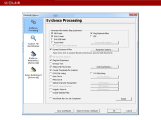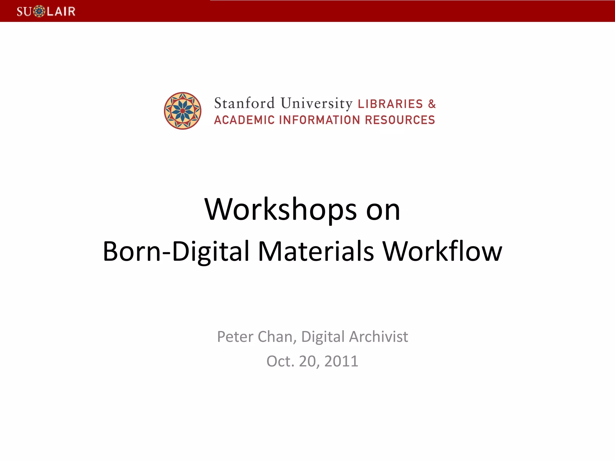 This document outlines the steps for imaging and processing born-digital materials, including: running virus checks, creating disk/logical images using FTK Imager, partitioning disks, identifying file systems, capturing images to evidence folders with case numbers, processing images in AccessData FTK including hashing and indexing files, and generating a collection summary report. The workflow is intended to thoroughly capture and document born-digital content for long-term preservation and access.