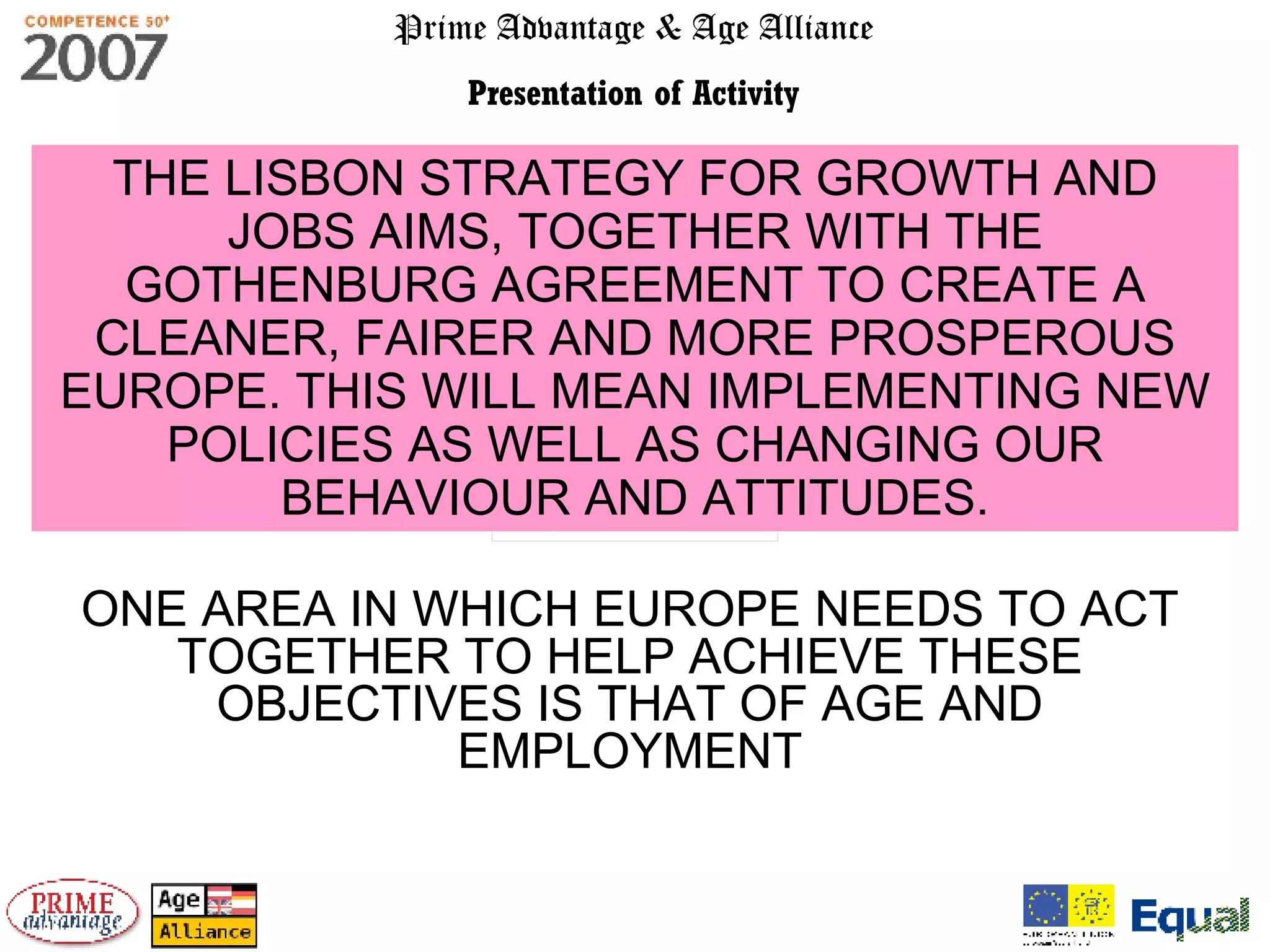 The document discusses projects in four European countries that addressed employment for older workers. The projects had different approaches but common themes of age management, assessment, career planning and training. They produced guides on good practices. Results included initiatives benefitting small businesses in Austria, 20% employment and innovation teams in Germany, job coaches in Poland, and support for over 200 UK individuals and 47 businesses. It recommends a holistic framework for older unemployed/workers.