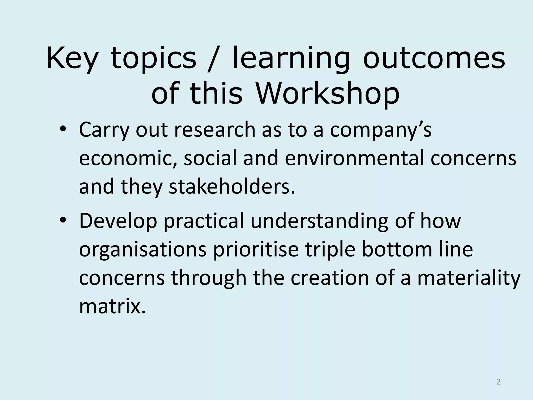 This document provides an overview of a workshop on using materiality matrices to assess the economic, social, and environmental concerns of a company and its stakeholders. The workshop involves researching a selected organization and creating a materiality matrix to identify and prioritize the most important sustainability issues. Participants will research a company, identify stakeholders and their concerns, and plot material issues on a matrix based on importance to both the organization and stakeholders. The materiality matrix is a useful tool for companies to establish sustainability priorities and support business cases.