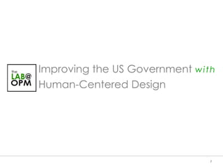 The document discusses strategies for enhancing the U.S. government through human-centered design by focusing on impact and data collection. It emphasizes the need for formal training, innovative staffing models, and the building of design capabilities within the organization. Additionally, it highlights the importance of measuring strategy effectiveness and demonstrating value through problem identification and outcomes.