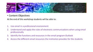 This document outlines an email workshop that teaches students how to use email professionally. The content objectives are to use email professionally, understand email communication rules, identify Outlook functions, and access institutional email resources. Language objectives are to read and write about the workshop, discuss in English, and learn 10 technical terms. The workshop instructs students to send practice emails with introductions, referrals, blind copies, resume attachments, and signatures. It also has students message classmates and attach a file. The workshop aims to achieve the content objectives of using email professionally and understanding Outlook functions and resources.