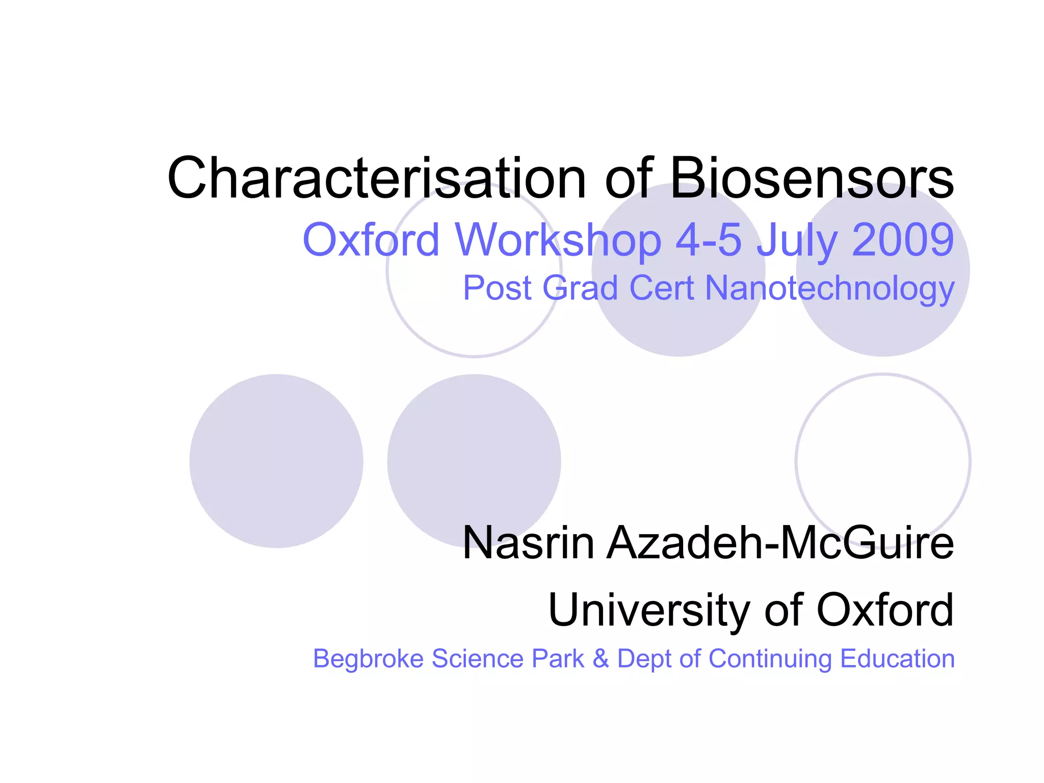 This document discusses characterization techniques for biosensors. It describes biosensors and immunosensors, and techniques used to characterize surfaces, including atomic force microscopy (AFM) to measure roughness, X-ray photoelectron spectroscopy (XPS) to determine composition and contamination, and time-of-flight secondary ion mass spectrometry (ToF-SIMS) for molecular fingerprinting and distribution. Self-assembled monolayers (SAMs) are discussed for functionalizing surfaces. Microcantilevers are also described as biological sensors operating in static or dynamic mode.