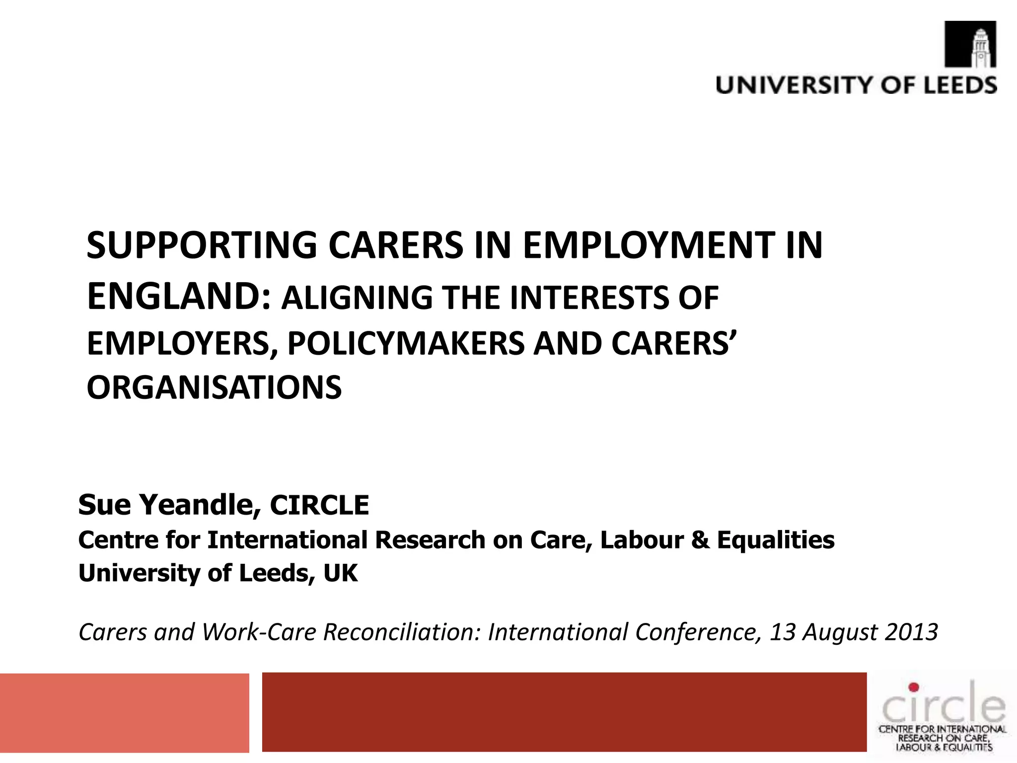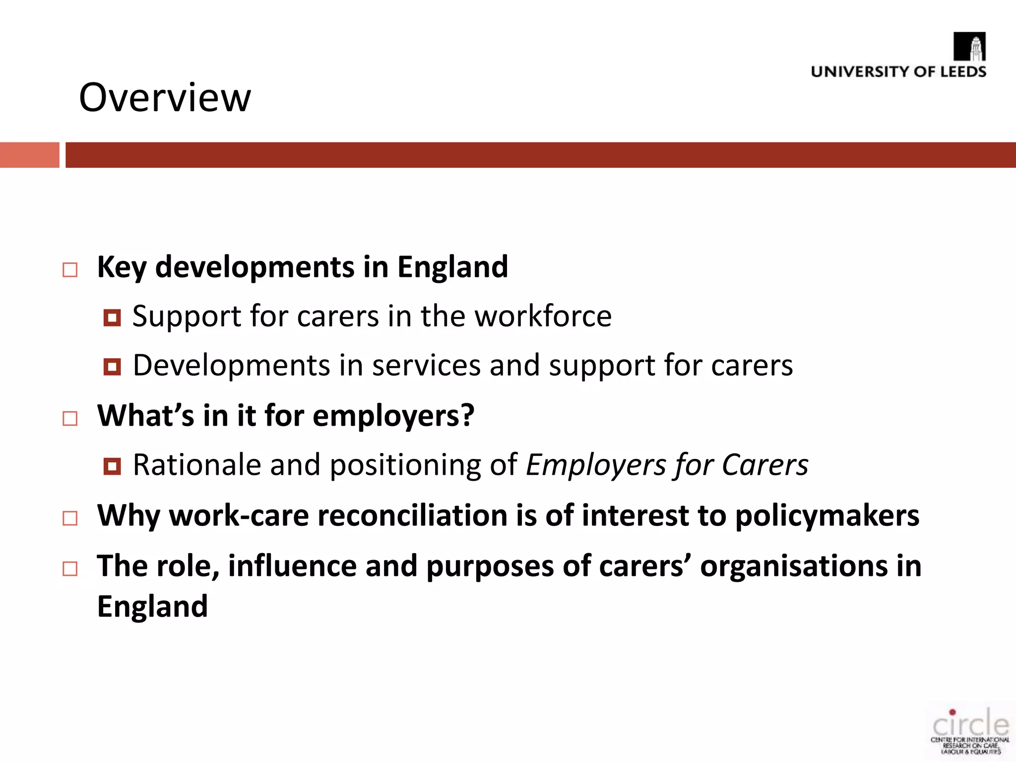The document outlines the importance of supporting carers in the workforce in England, emphasizing the need for reconciliation between work and care roles. It discusses various policies, support strategies, and the role of employers and carers' organizations in improving the situation for carers, who number around 5.4 million. It highlights the business benefits of supporting working carers and the alignment of interests among employers, policymakers, and carers’ organizations in enhancing care services.