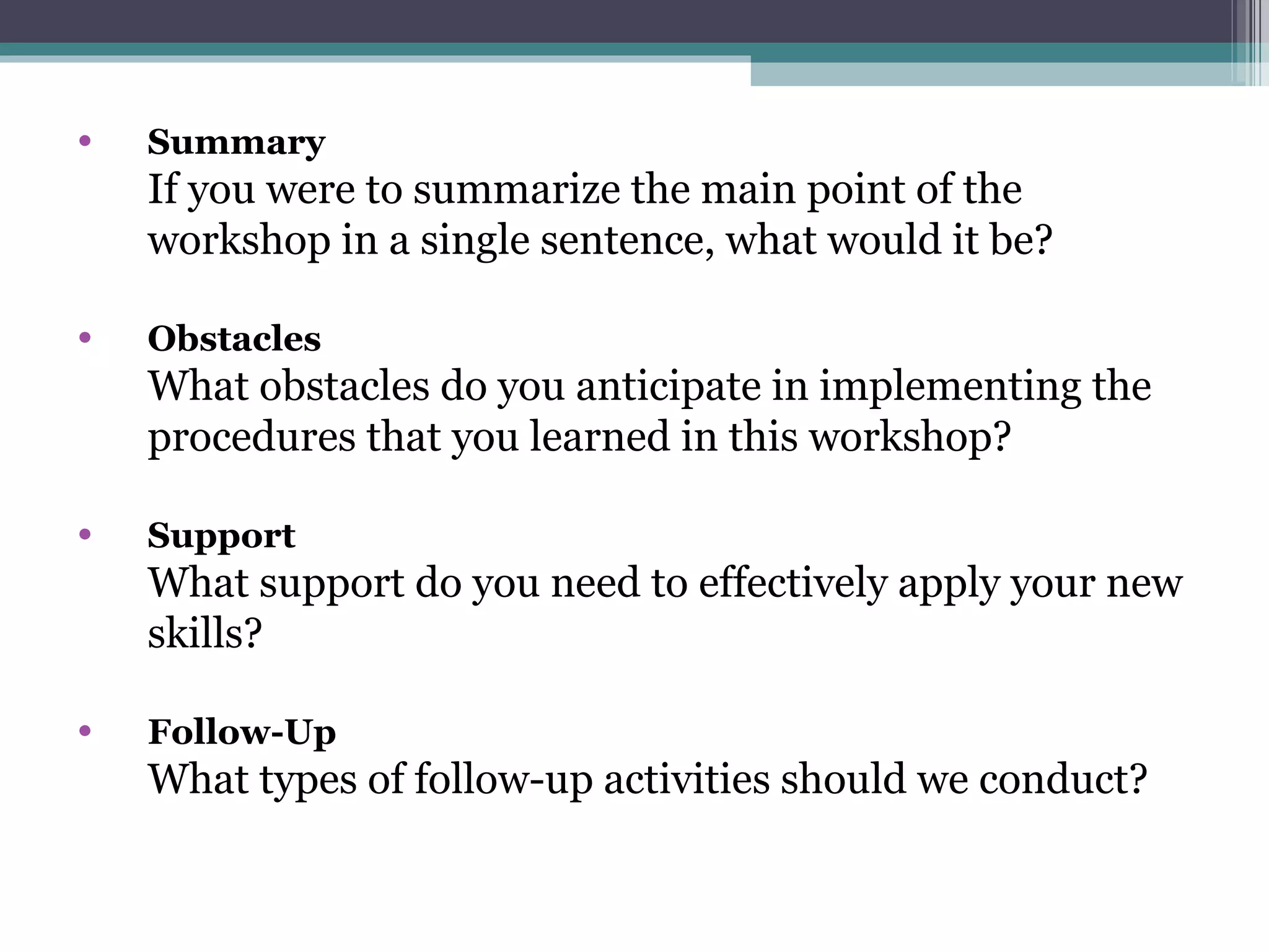 Summary Ifyou were to summarize the main point of the workshop in a single sentence, what would it be? Obstacles What obstacles do you anticipate in implementing the procedures that you learned in this workshop? Support What support do you need to effectively apply your new skills? Follow-Up What types of follow-up activities should we conduct?