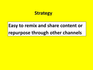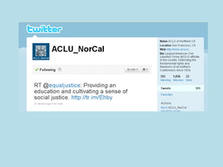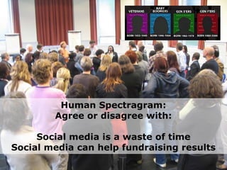 This document summarizes a presentation on effective social media strategy and tactics for nonprofits. It discusses generating buzz through social content, engaging supporters across multiple social media channels, and listening to better understand supporters. Tactics include identifying influencers on social media, tracking metrics like retweets and click-throughs, and creating a safe space to experiment with social media projects. The presentation stresses testing small projects, learning from successes and challenges, and copying strategies from other nonprofits.