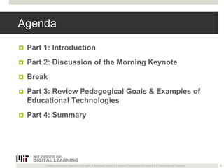 The document summarizes a workshop presented by M.S. Vijay Kumar and Brandon Muramatsu at KFUPM in Dhahran, Saudi Arabia on using educational technology to enhance learning opportunities. The workshop covered MIT's approach of using technology to support pedagogical goals like active learning, hands-on experiences, improving mastery of concepts, and sharing teaching practices. Examples of educational technologies at MIT were discussed, including virtual labs, simulations, visualizations, and OpenCourseWare. Participants identified teaching issues at KFUPM and how educational technologies could help address them. The workshop aimed to help participants understand how technology supports learning and identify opportunities to innovate using these approaches at KFUPM