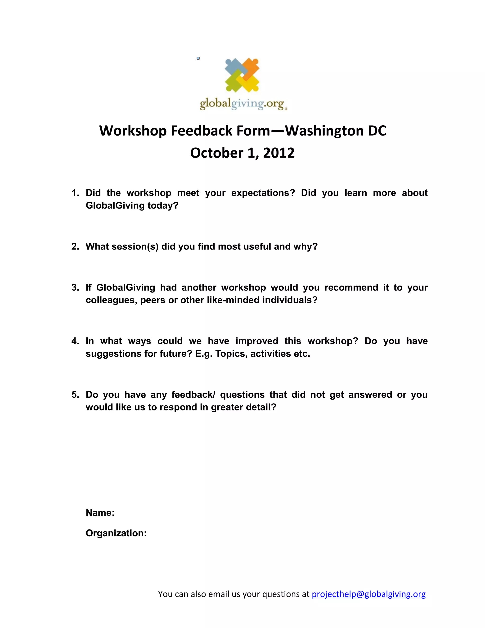This workshop feedback form from October 2012 in Washington DC asks attendees about their experience at a GlobalGiving workshop. It inquires whether the workshop met expectations and if they learned about GlobalGiving. Attendees are asked which sessions they found most useful and why. The form also questions if they would recommend a future workshop to colleagues and how the workshop could be improved, including topic and activity suggestions. Attendees can provide any additional feedback or questions.