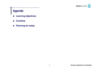 The document outlines a workshop focused on key components of innovation in tourism, emphasizing knowledge sharing and intuitive innovation. Participants will engage in multiple sessions aimed at identifying and describing innovative tourism products for continental markets. By the end of the workshop, attendees are expected to have improved skills in brainstorming, managing consensus decisions, and applying intuitive problem-solving techniques.