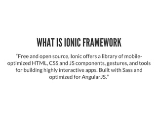 The Ionic Framework is a free and open-source toolkit that allows developers to create mobile applications using HTML, CSS, and JavaScript. Key features include a powerful command line interface, live reloading, icon generation, and support for AngularJS. It provides an ecosystem with tools for building, testing, and deploying hybrid applications, along with options for prototyping and backend services.