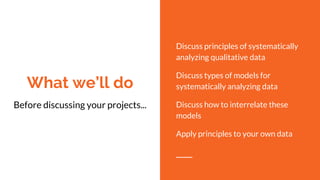 The document outlines methods for systematically analyzing qualitative data, emphasizing the importance of relating data to research questions and interconnecting various analytical models such as network, flow, and matrix models. It discusses the value of visual representations to uncover relationships in qualitative data and explores how these models can aid in hypothesis development. Additionally, the document guides researchers in applying these principles to their projects by facilitating discussions around their data and analytical needs.