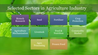 The document outlines a workshop on sector analysis in the agriculture industry, focusing on various sectors such as biotech research, seed, fertilizer, and livestock feed. It discusses components of sector analysis including industry and environment analysis, value chain analysis, market forces, and competition. Key areas covered include macro and micro environment factors, competition analysis, and the role of various stakeholders in the agriculture sector.