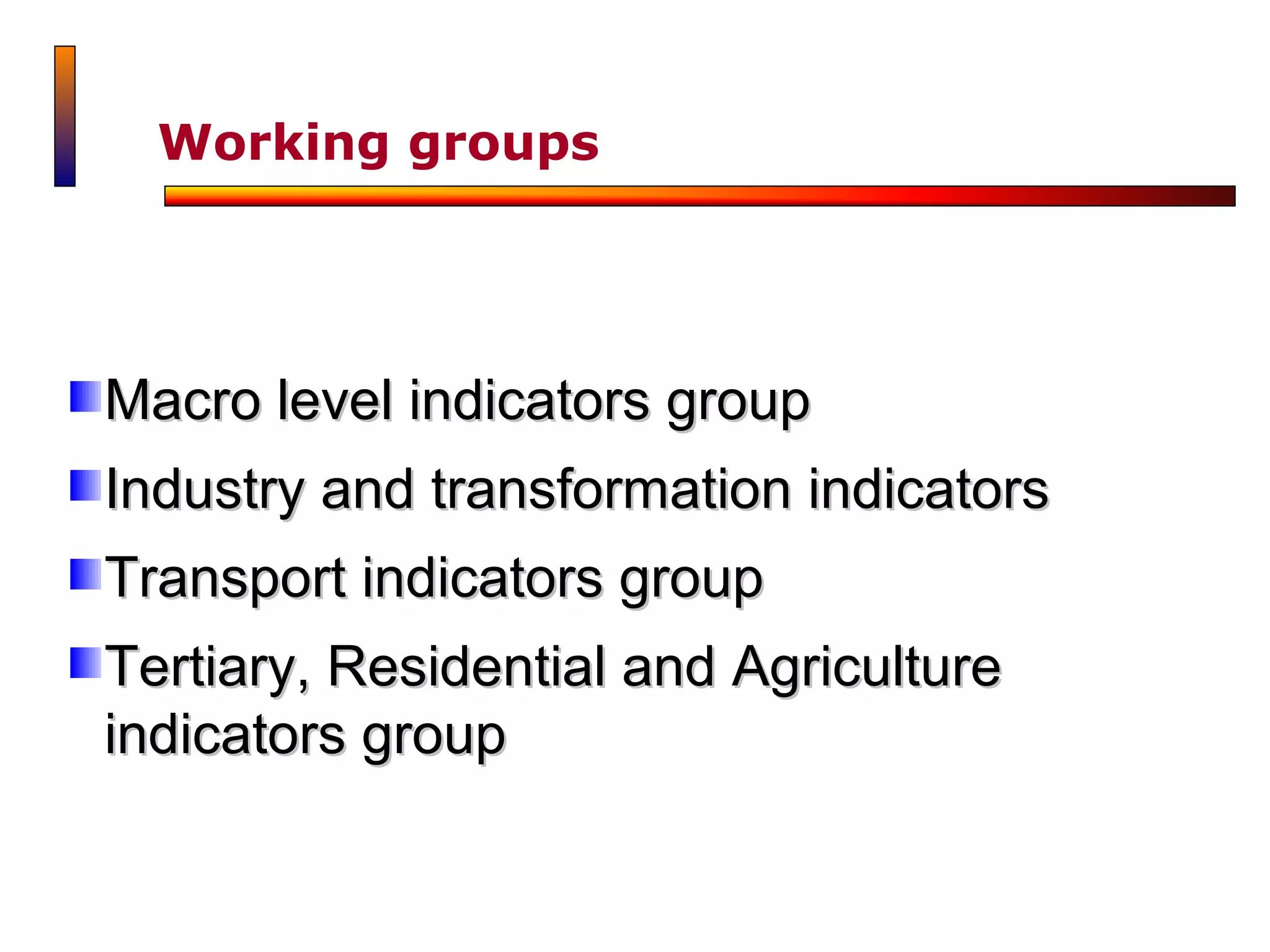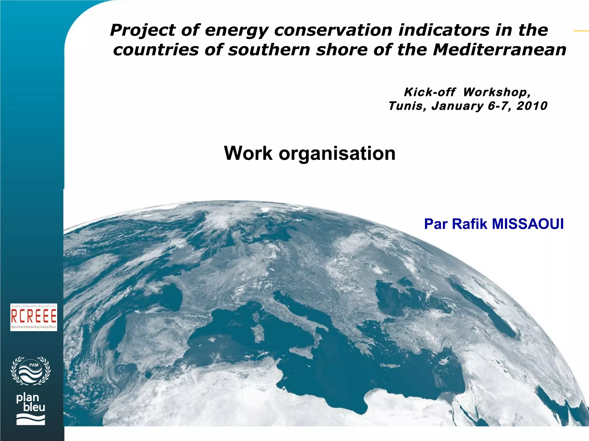 This document outlines the organization of working groups and tasks for a project on energy conservation indicators in Mediterranean countries. It discusses the formation of groups to validate proposed indicators, identify data sources, and assess difficulties in obtaining data. The document also provides a timeline for the first round of data collection between January and February, with a validation workshop planned for mid-March. Contact information is given for project leads to facilitate communication by email, phone, and Skype.
