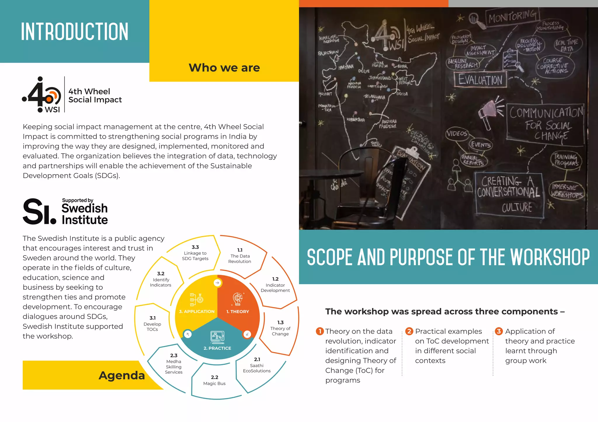 The document details a workshop conducted by 4th Wheel Social Impact and the Swedish Institute aimed at enhancing social program design and evaluation in India by identifying and measuring contextualized indicators for Sustainable Development Goals (SDGs). It discusses the importance of data collection, theory of change (TOC) development, and best practices for indicator identification through practical group exercises. The workshop brought together development practitioners to share experiences and improve capacities in utilizing data and creating effective theories of change to track progress towards achieving global goals.