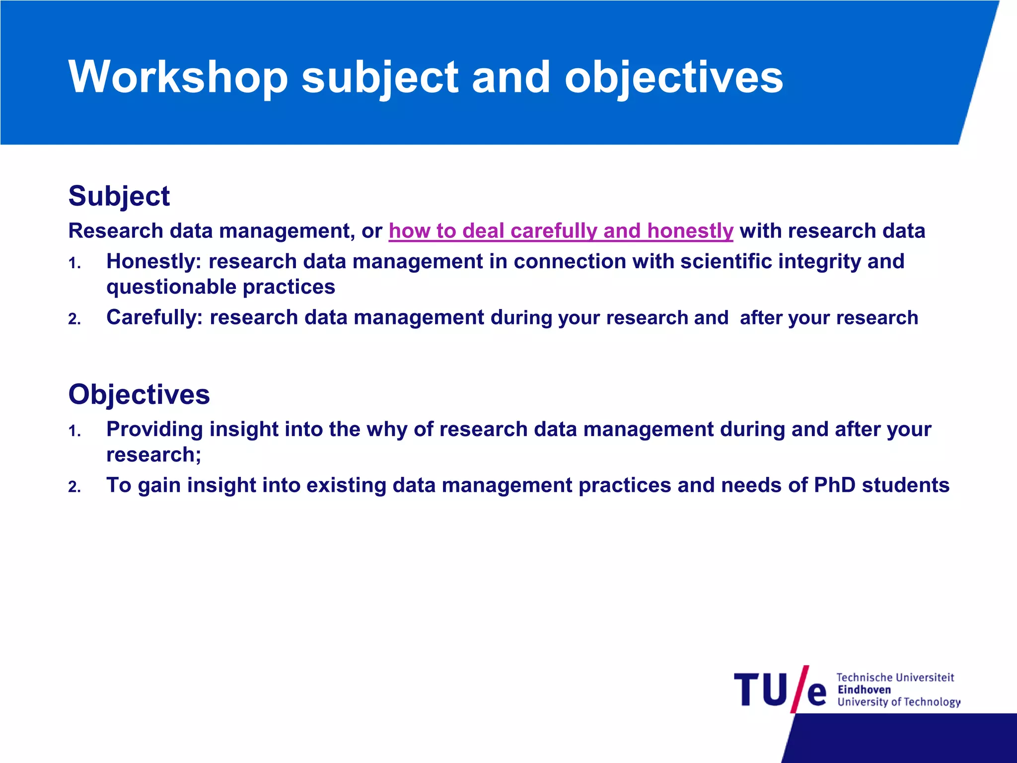 This document outlines a workshop on research data management for PhD students. The workshop covers managing data during research to ensure integrity and allow replication, as well as archiving or publishing data after research. During the workshop, presentations will discuss scientific integrity and data management during research, and data management after research. Discussions will explore topics like dealing with failed experiments, accessibility of data during research, and archiving data after a project is finished. The goal is to provide insight on responsible data practices during and after research.