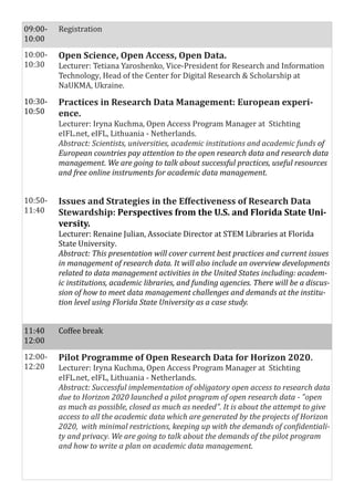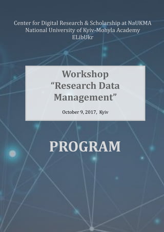 This document outlines the program for a workshop on research data management held in Kyiv, Ukraine on October 9, 2017. The workshop included lectures and workshops on topics such as open science, research data practices in Europe, issues in research data stewardship from US perspectives, the Horizon 2020 pilot program for open research data, considerations for research data sharing, and developing strategies for research data management at the organizational level. Speakers included experts from the National University of Kyiv-Mohyla Academy, eIFL.net, and Florida State University.