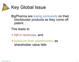 This document provides advice to small and medium pharma-biotech companies on partnering with large pharmaceutical companies ("BigPharma"). It notes that BigPharma are losing revenue as blockbuster drugs go off patent, creating opportunities for partnering. However, only 15% of small company proposals are reviewed. The document recommends understanding BigPharma therapeutic interests and deal stages, positioning IP accordingly. Companies should understand each BigPharma partner's needs and consider different deal structures. Raising their profile through marketing, conferences, and consultants can help small companies get noticed. The overall goal is for small companies to effectively engage BigPharma around innovative assets that meet strategic priorities.