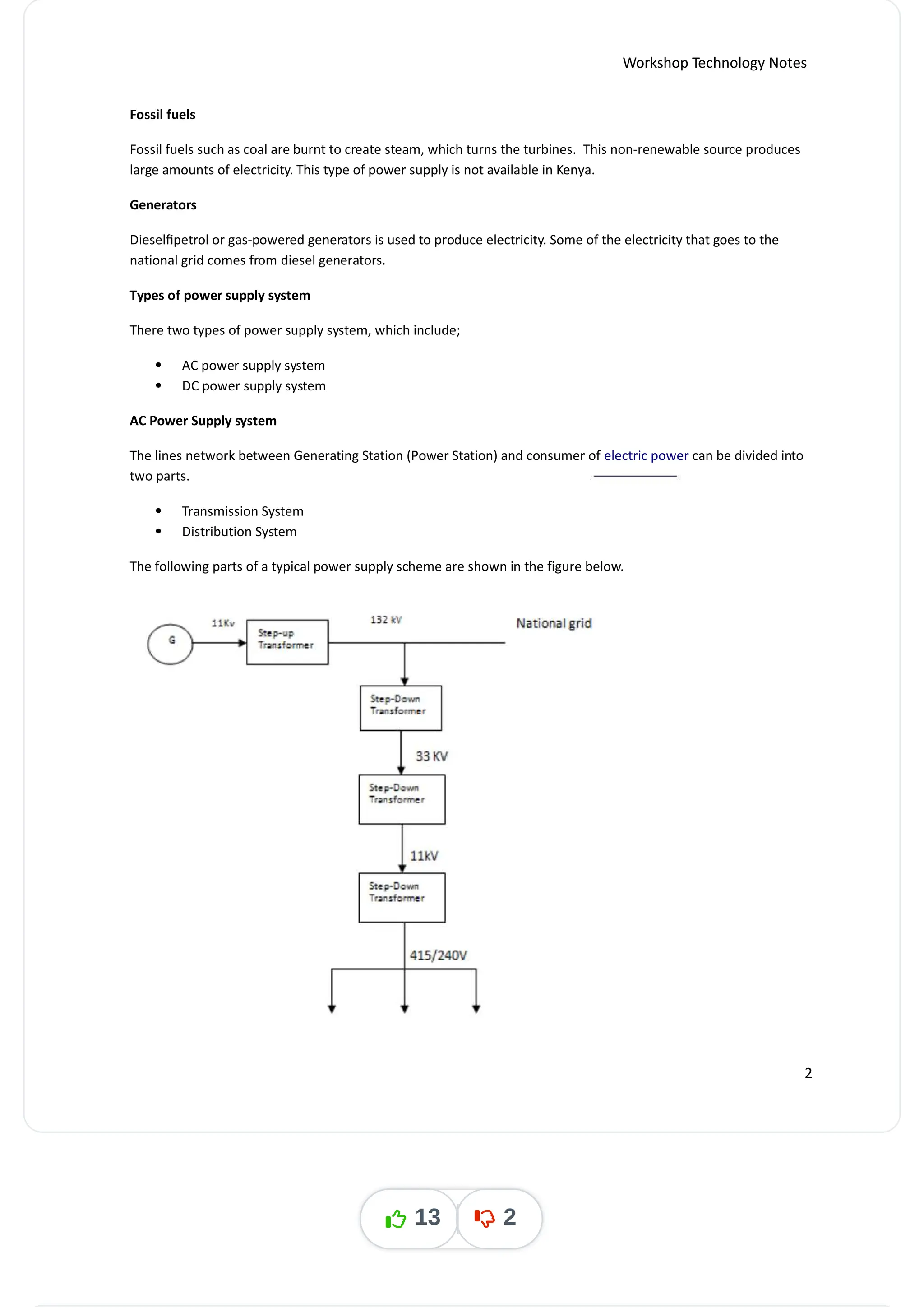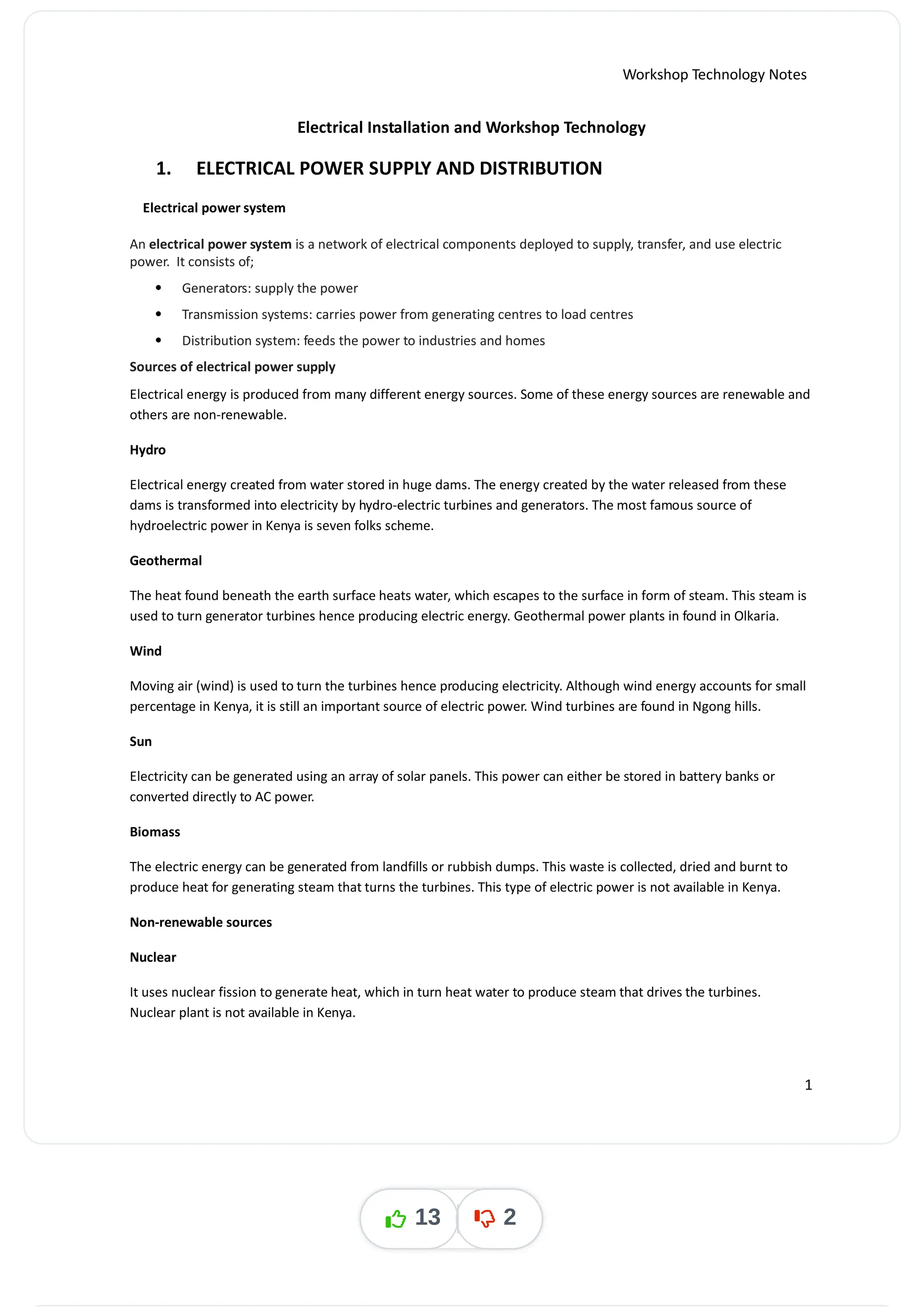The document outlines electrical power systems, emphasizing the components involved in supplying, transferring, and utilizing electric power, such as generators, transmission systems, and distribution systems. It covers renewable and non-renewable energy sources, types of power supply systems, and characteristics of various distribution system topologies like radial and ring main systems. Additionally, it discusses power supply equipment, conductors, cables, and their installation and maintenance, adhering to IEE regulations.