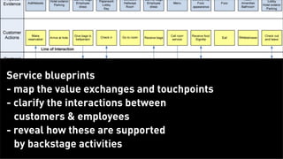 The document discusses service blueprints, which expose the core structure of services. Service blueprints show the key touchpoints in a service through which customers interact with employees, spaces, devices, and other entities to co-create the service experience. They illustrate the lines of interaction, visibility, and internal processes involved in delivering the service. An example blueprint is provided for the process of dropping off and picking up a prescription at a pharmacy.