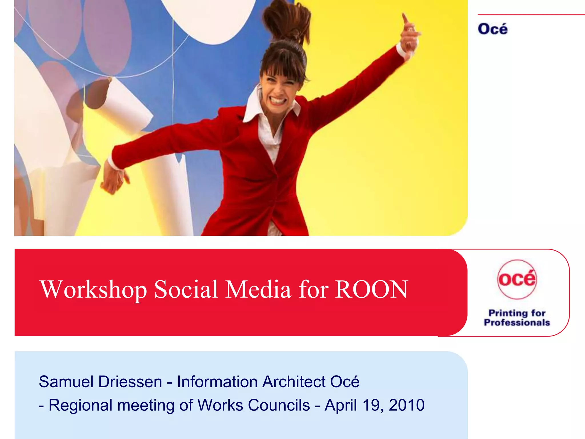 The document describes a workshop on social media for ROON. It begins with the workshop goals of describing Web 2.0 and Enterprise 2.0 and reflecting on their relevance to ROON. Videos are shown on social media and shifts in business, and participants discuss what they see and how their company is responding. Key concepts of Web 2.0/Enterprise 2.0 are defined, including harnessing collective intelligence and applying social software within companies. Paradigm shifts from the industrial age to the network age are covered. Examples of social media tools like blogs, wikis, and social networks are provided, along with brief explanations of what they are.