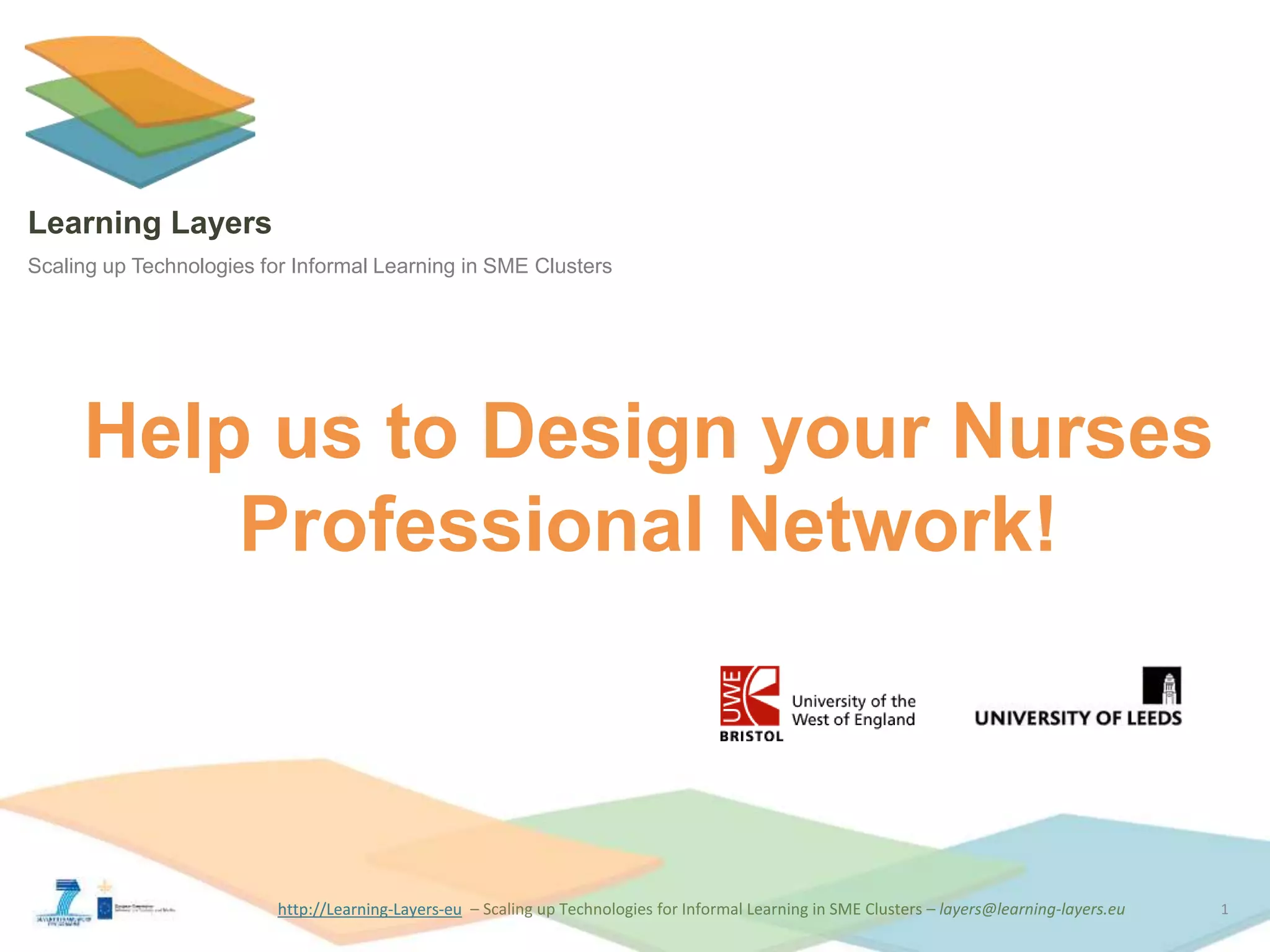 This document discusses co-designing professional networks for nurses in Bradford City, UK. It outlines the current situations of three potential networks: 1) a new nurses network with variable attendance, 2) an established practice managers' network, and 3) the potential for a new data quality leads network. The document explores how social networking tools like LinkedIn could support expanding these professional networks by improving sharing of knowledge, workload, and expertise in order to strengthen members' voices and professional development through mentoring and reduced isolation. Workshops were planned to help co-design a help seeking tool to meet the nurses' network needs.