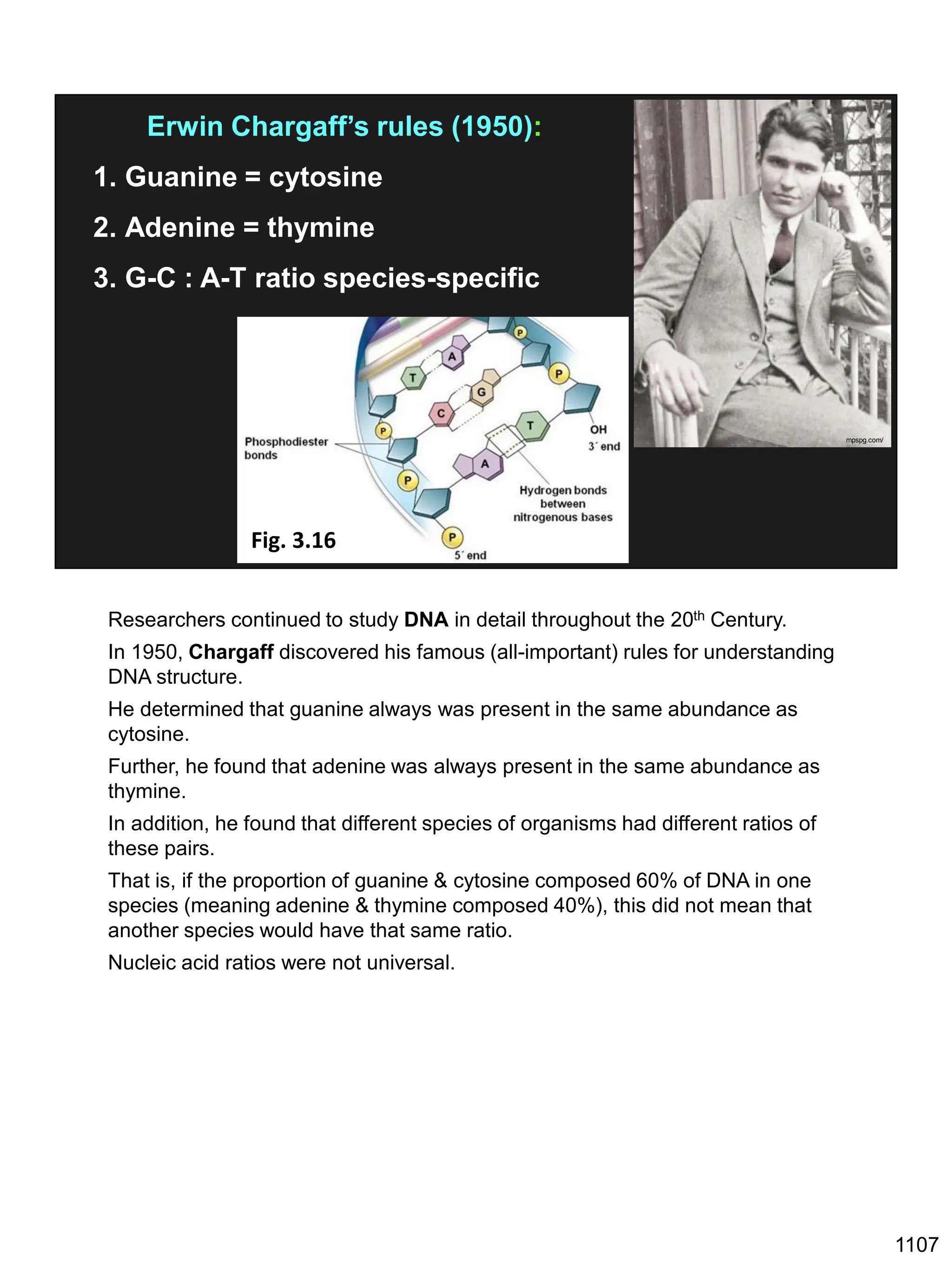 Erwin Chargaff discovered in 1950 that guanine always pairs with cytosine and adenine always pairs with thymine in DNA. He also found that different species have different ratios of these base pairs. In 1953, Rosalind Franklin used x-ray crystallography to take a photo of DNA structure. James Watson and Francis Crick used Chargaff's rules and Franklin's photo to deduce the double helix structure of DNA. This provided the first understanding of DNA's molecular structure and established it as the molecule responsible for inheritance.