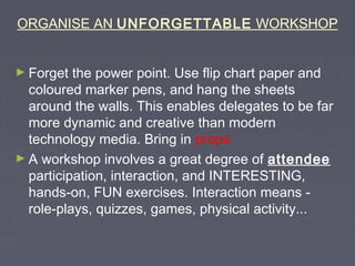 The document provides guidance for organizing an engaging 10-minute workshop with participant interaction. It emphasizes using visual aids like flip charts instead of PowerPoint, as well as interactive exercises involving activities, role-plays, games, and physical movement. Participants should be divided into groups to work on different topics and the workshop should start with a hook to get everyone involved from the beginning.