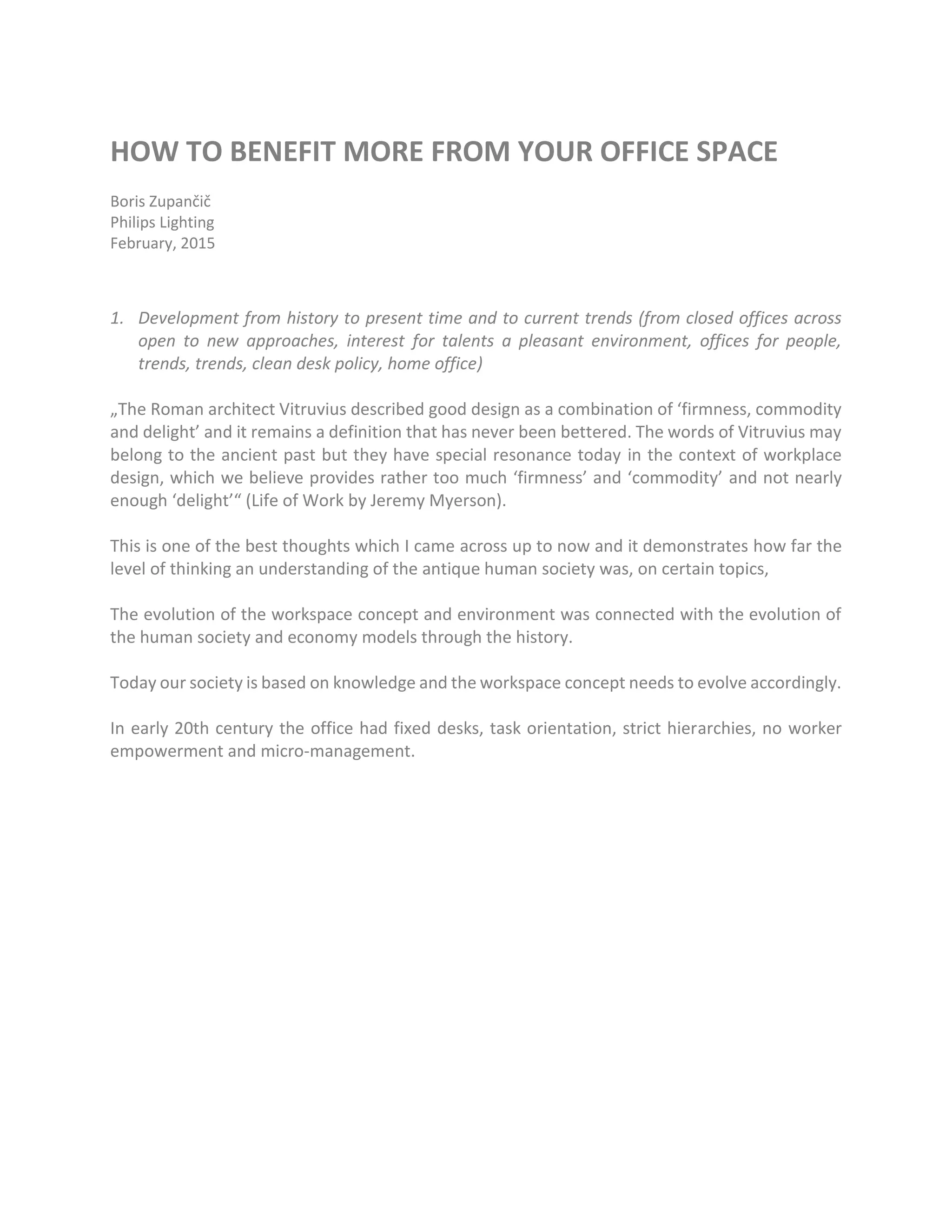 The document discusses the evolution and optimization of office spaces, emphasizing the shift from traditional closed offices to activity-based workspaces that enhance collaboration and meet diverse employee needs. It highlights the importance of workspace design in attracting talent, fostering company culture, and improving productivity by addressing comfort, acoustics, and aesthetics. The author advocates for a thoughtful approach to workspace planning to create environments that support both individuality and teamwork, ultimately benefiting company performance and employee satisfaction.
