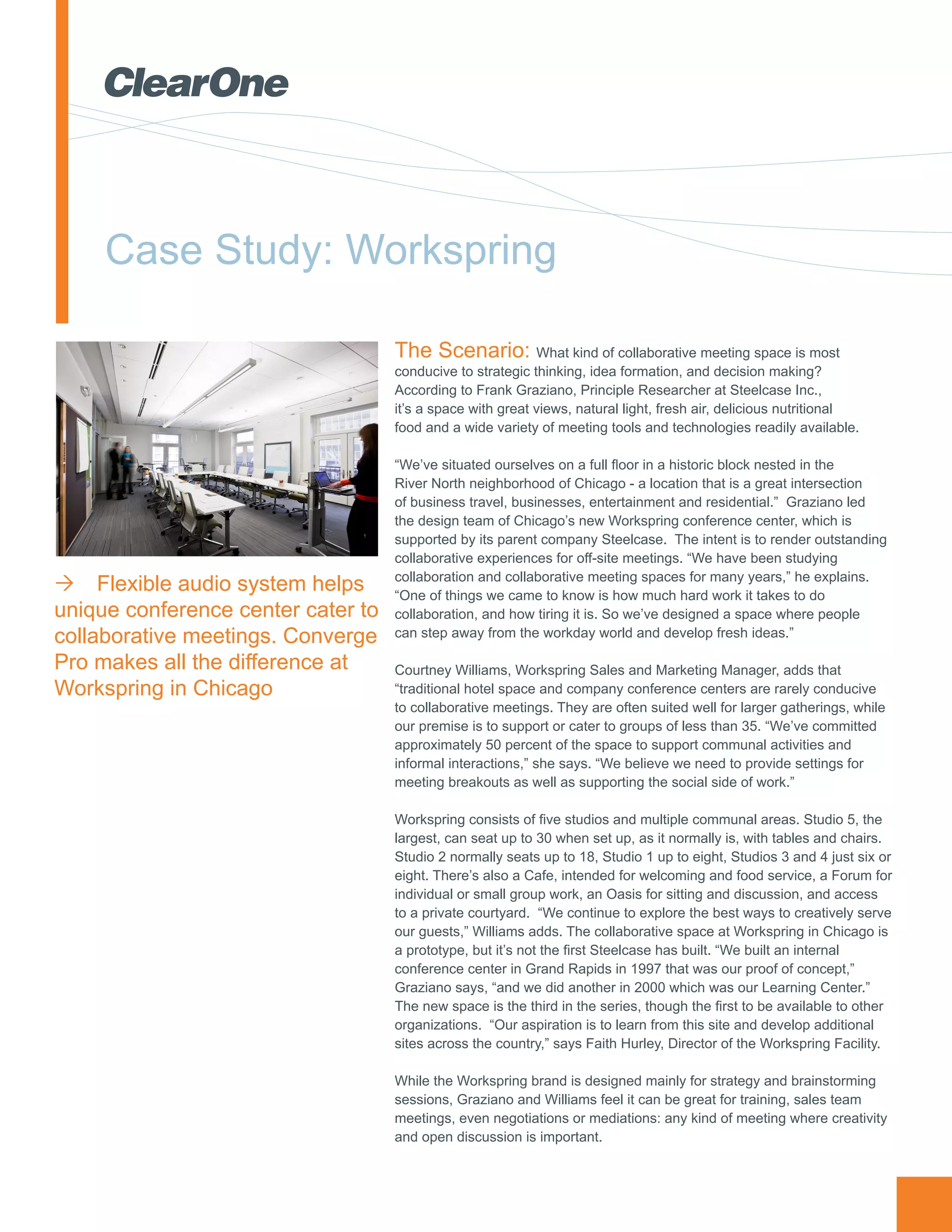 The document discusses the Workspring conference center in Chicago, which was designed by Steelcase to be a collaborative meeting space conducive to strategic thinking and idea formation. It has various meeting studios and communal spaces with natural light, views and healthy food options. The technology at Workspring allows participants to easily share content between laptops and digital screens. An audio system using ClearOne Converge Pro processors provides high-quality audioconferencing across the different meeting spaces. The flexible ClearOne system was able to handle the challenges of the Workspring space, including echo cancellation between ceiling microphones and speakers in one large studio.