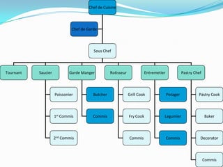 The document describes the brigade system used in professional kitchens to organize staff. It explains that chefs adopted the military's brigade system using a chain of command. Key positions include the chef de cuisine at the top followed by sous chefs, chef de garde, tournant and various station chefs overseeing areas like sauce, meat, fish, etc. Down the chain are commis assistants and cross training allows flexibility. Beyond the kitchen, departments include dining room, purchasing, and catering.