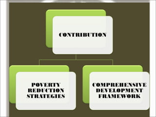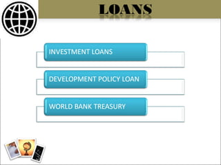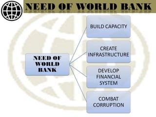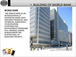 The World Bank is an international organization that provides financial and technical assistance to developing countries for programs aimed at reducing poverty. It was established in 1944 and has 185 member countries. The World Bank aims to reduce poverty through lending, grants, analytical services, and capacity building for projects related to agriculture, education, health, and other sectors. However, critics argue that the World Bank promotes Western interests and lacks transparency and democratic decision making.